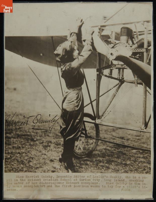 copy signature on front: Harriet Quimby typed at bottom border of image: Miss Harriet Quimby, Dramatic Editor of Leslie's Weekly, who is a pupil / in the Moisant Aviation School at Garden City, long Island, cranking / the motor of her 30-horsepower Moisant monoplane. Miss Quimby is the on- / ly woman monoplanist and the first American woman to try for a pilot's license. / #1005