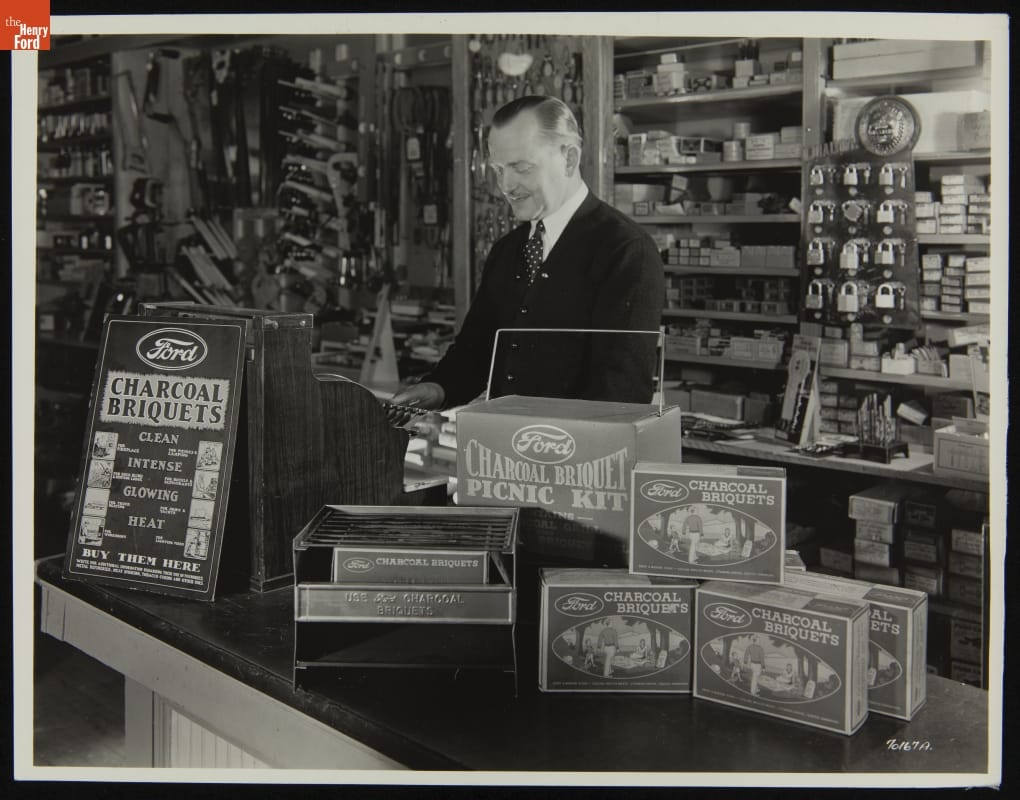 Ford Charcoal Briquets and Picnic Kit Display in a Hardware Store, 1938