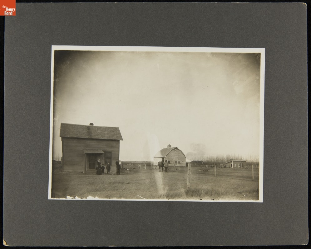 This photograph shows the young Finger family on their 240-acre "bonanza" farm. They raised grain for market, but also grew feed for their poultry, pigs, horse, and dairy cow. Their farm, two miles east of the Great Northern Railroad depot in Berthold, N.D., gave them market access, while living on a Rural Federal Delivery mail route and telephone line right-of-way connected them beyond Berthold.