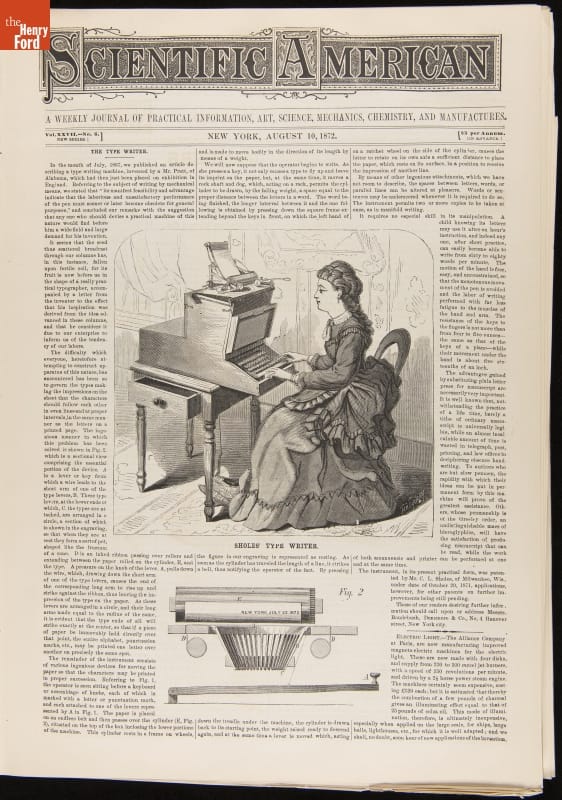 In 1867, Carlos Glidden showed an article about the mechanical "pterotype" writing machine to colleagues Christopher Latham Sholes and Samuel Soule. At the time, the group was inventing a page numbering machine, and was inspired to add text printing capabilities. The eventual result became the first commercially successful typewriter, featured on the cover of this 1872 issue of Scientific American.