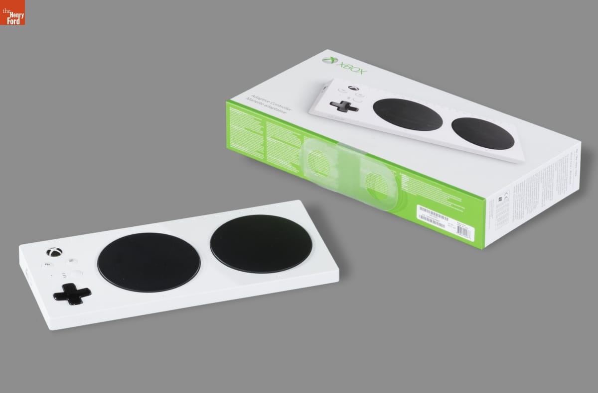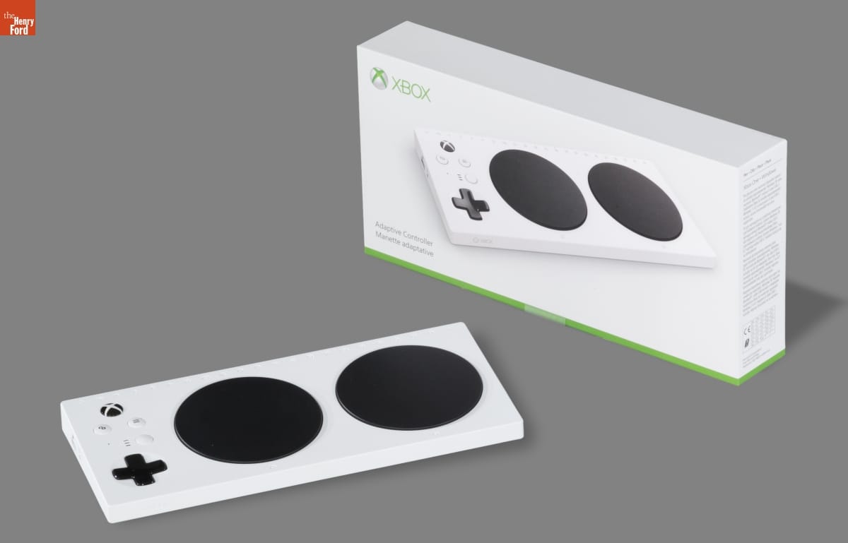 This video game controller was the first controller to be designed from the ground-up--by and for--gamers with disabilities and mobility challenges. Oversized buttons and triggers can be remapped to adapt to physical needs. Screw mounts on the bottom are used for attachment to wheelchairs. Output jacks allow further customization with foot switches, one-handed and mouth-controlled joysticks.