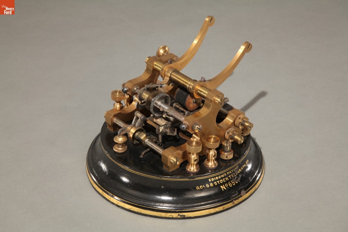 Painted on base: GOLD STOCK TELEGRAPH CO.; EDISON & UNGER MAKERS; NEWARK, N.J.;