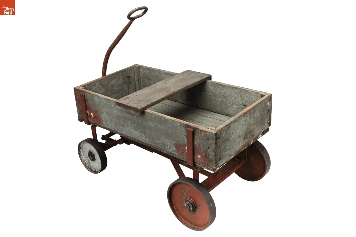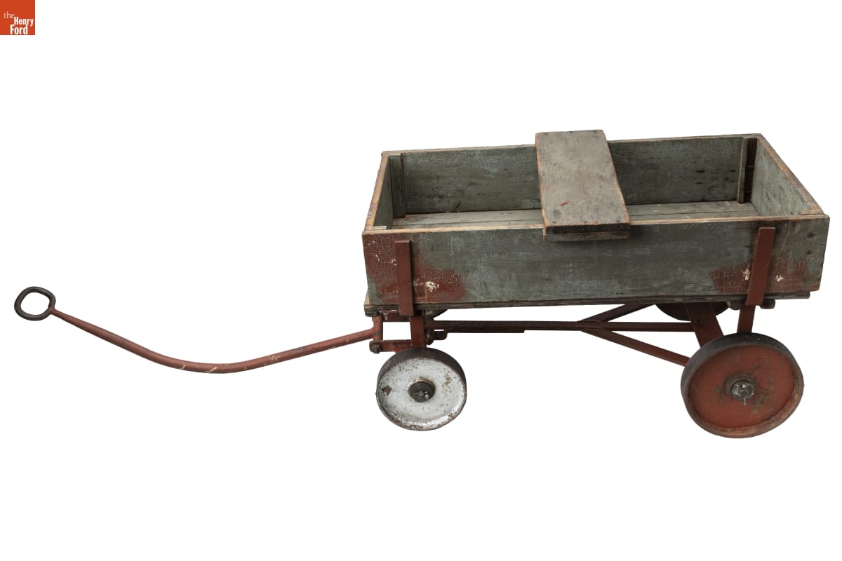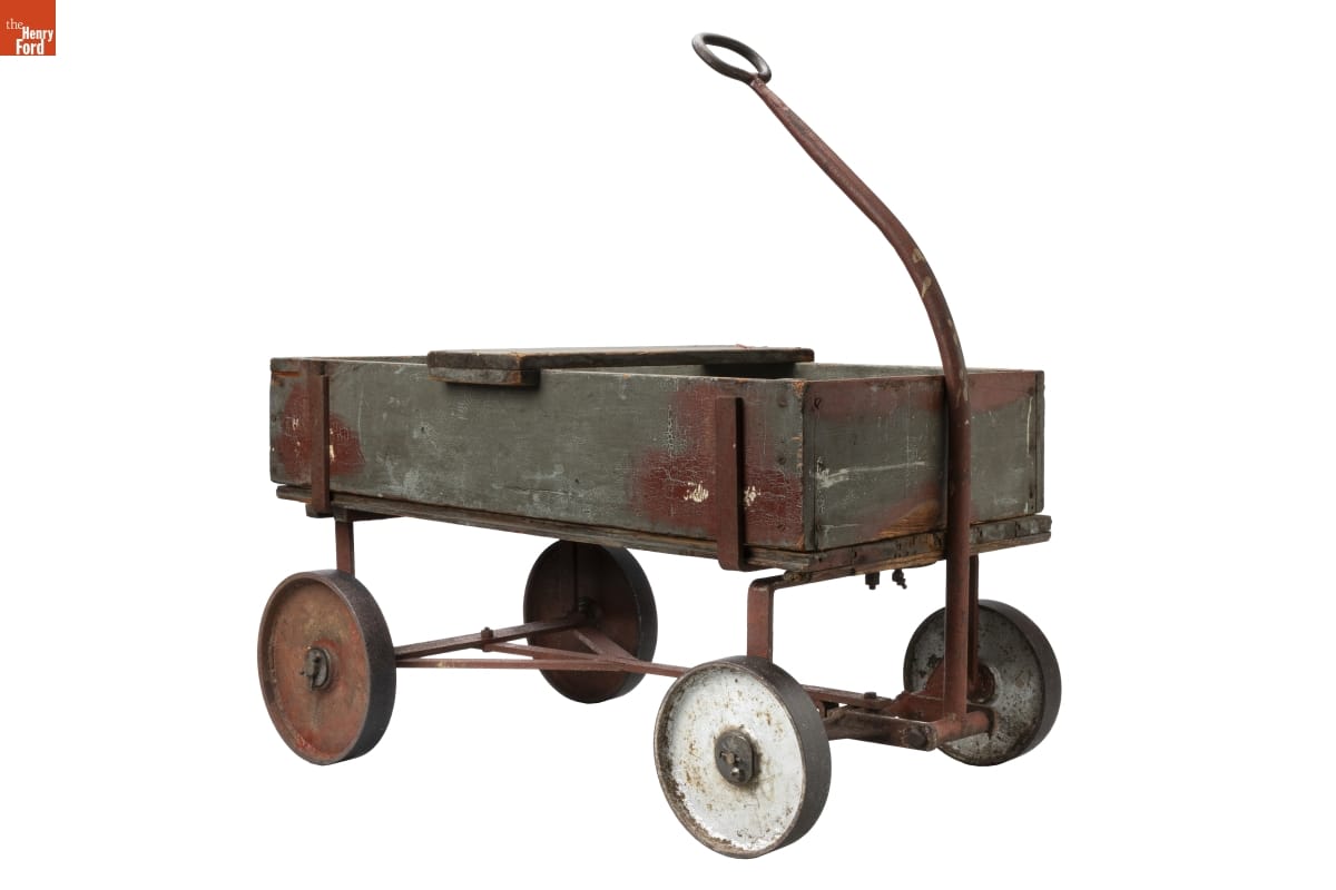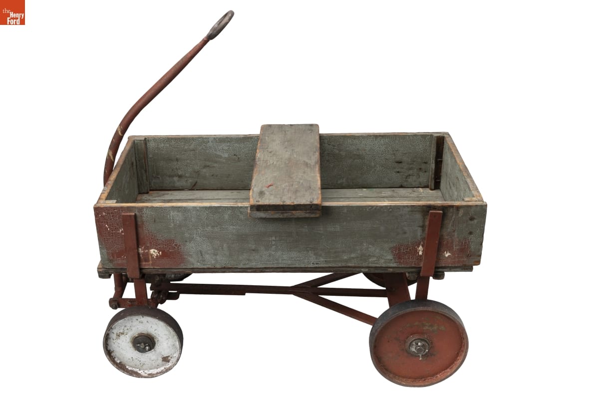 Cleoda Davis, a pipe fitter at a Detroit, Michigan chemical company, built this wagon during World War II for his son Allen. Davis used scrap wood and salvaged metal from work. Wartime restrictions limited resources like rubber and metal for toys, and many companies had switched from creating civilian goods to producing materials essential to the war effort.