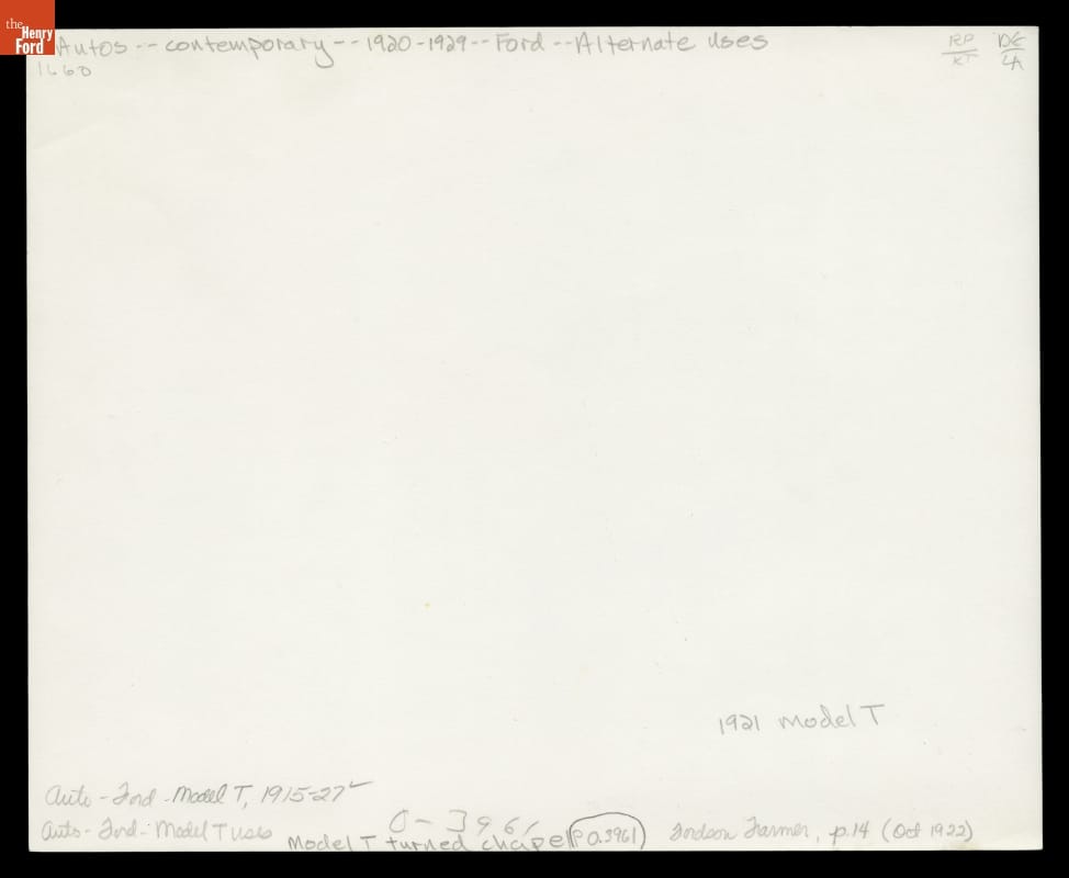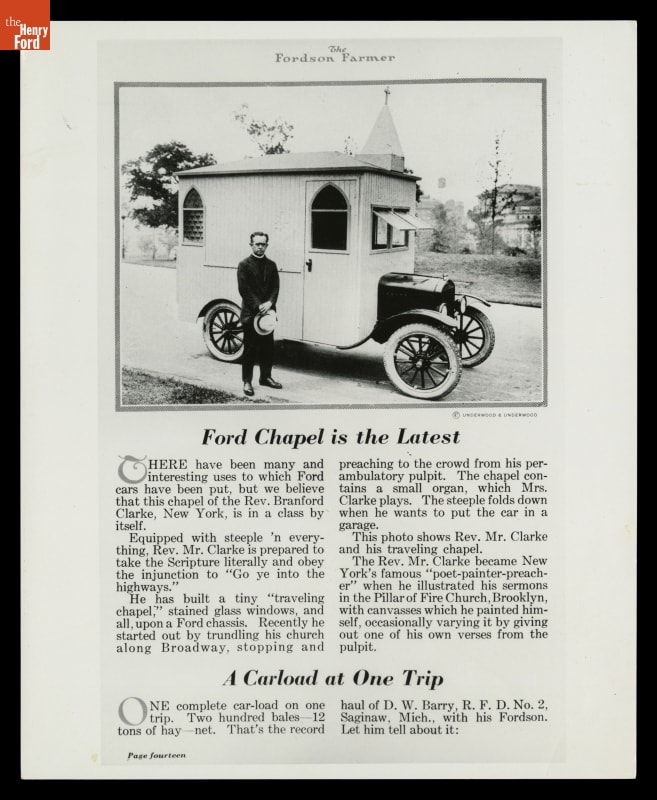 In 1922, Ford Motor Company published the story of Reverend Branford Clarke and his mobile chapel, based on a Model T chassis. Entirely self-designed, the chapel featured a small organ and a steeple that could fold down. Ford used individual stories like Reverend Clarke's to advertise its Model T as a sturdy, versatile automobile that could change ordinary Americans' lives.
