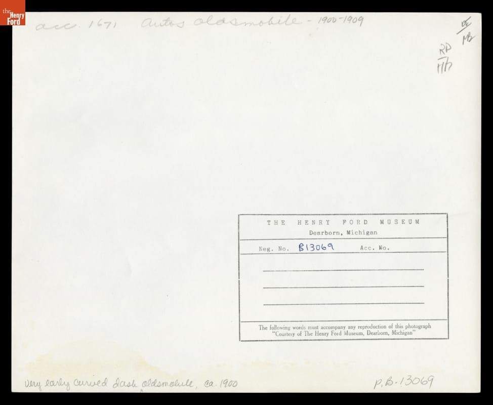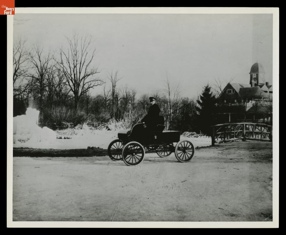 R. E. Olds in a Curved-Dash Oldsmobile near the Pavilion on Belle Isle, Detroit, Michigan, January, 1902