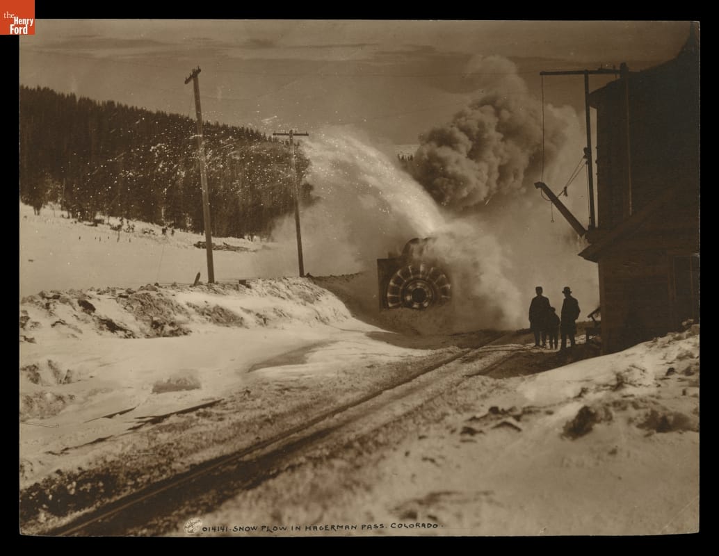 Rotary snowplows were a railroad's most sophisticated offense against winter. The massive machines cleared drifted snow from the track. An on-board steam engine powered two sets of fan blades. The first set dug into the snow, while the second threw the snow off to the side. Rotary plows were not self-propelled, so a separate locomotive pushed from behind.