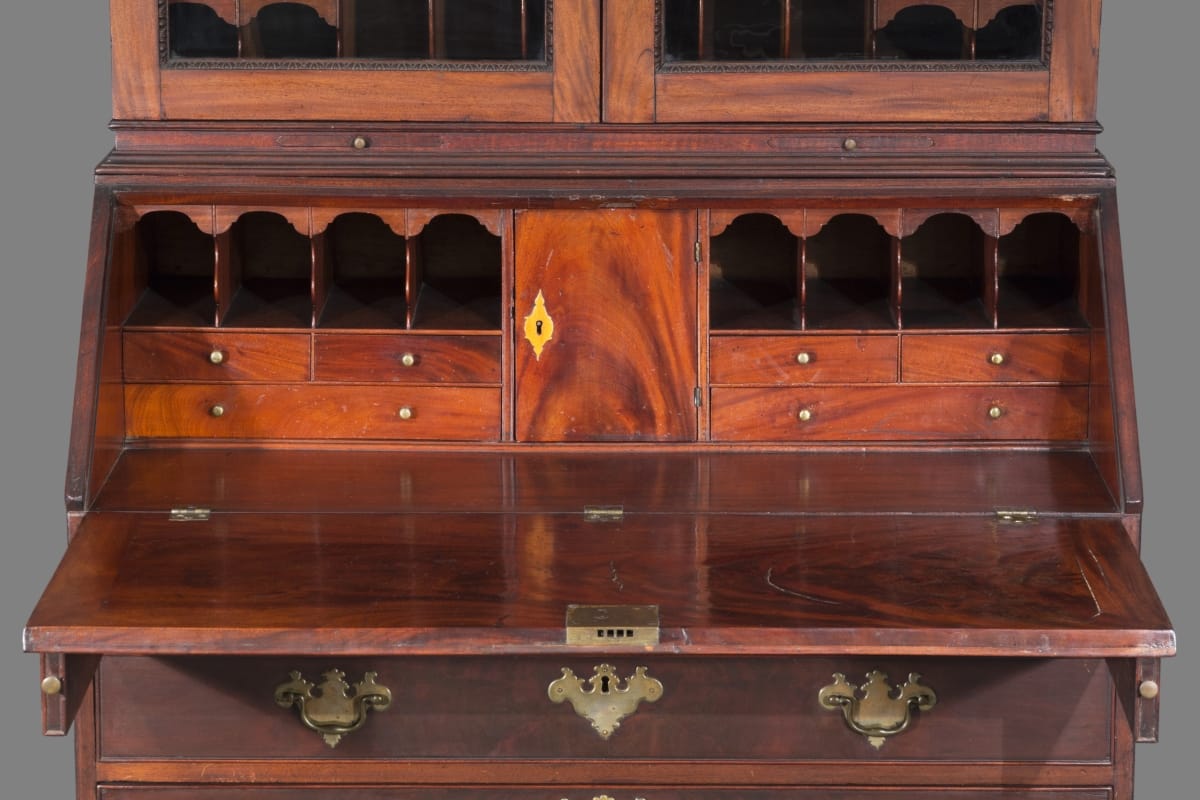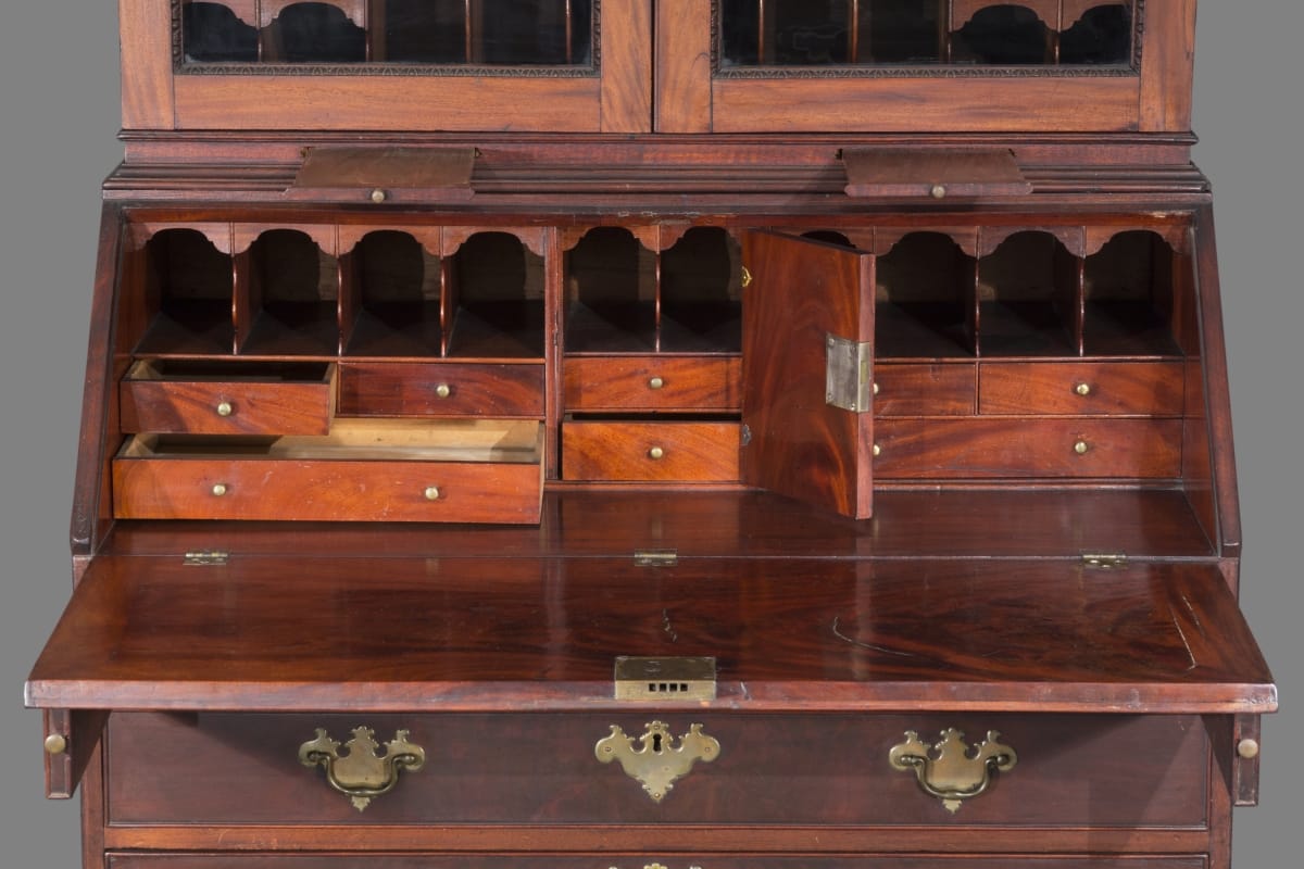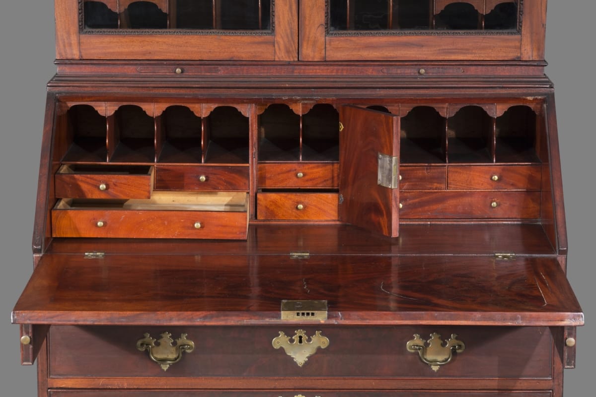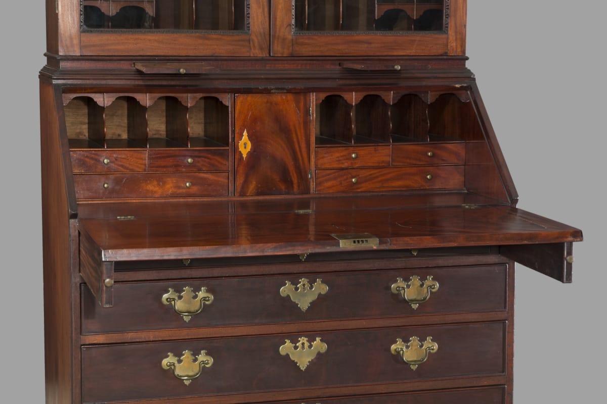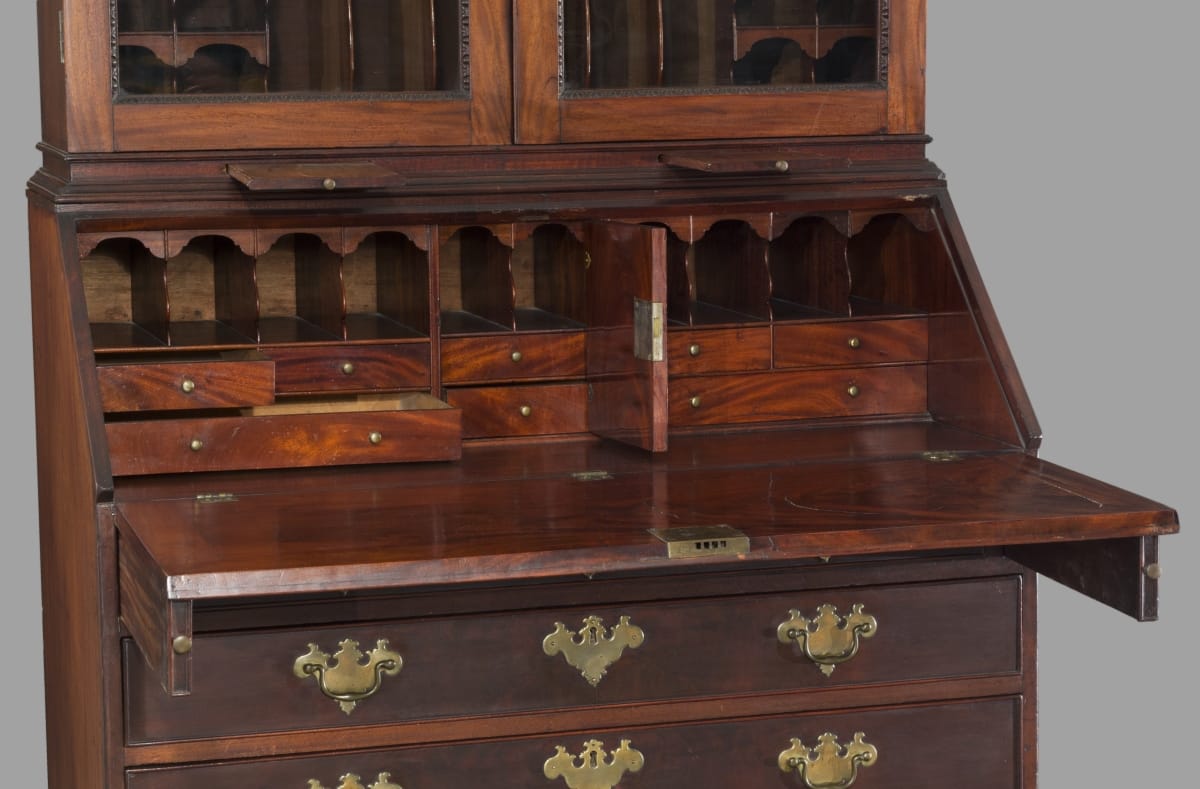 American businessmen and merchants in the mid-18th century used secretary desks as home offices. These large desks provide a writing surface, shelves for books and a storage space for papers -- perhaps even a secret drawer for important documents. Placed in a parlor or other public room, this secretary projected the owner's wealth and social status to visitors.