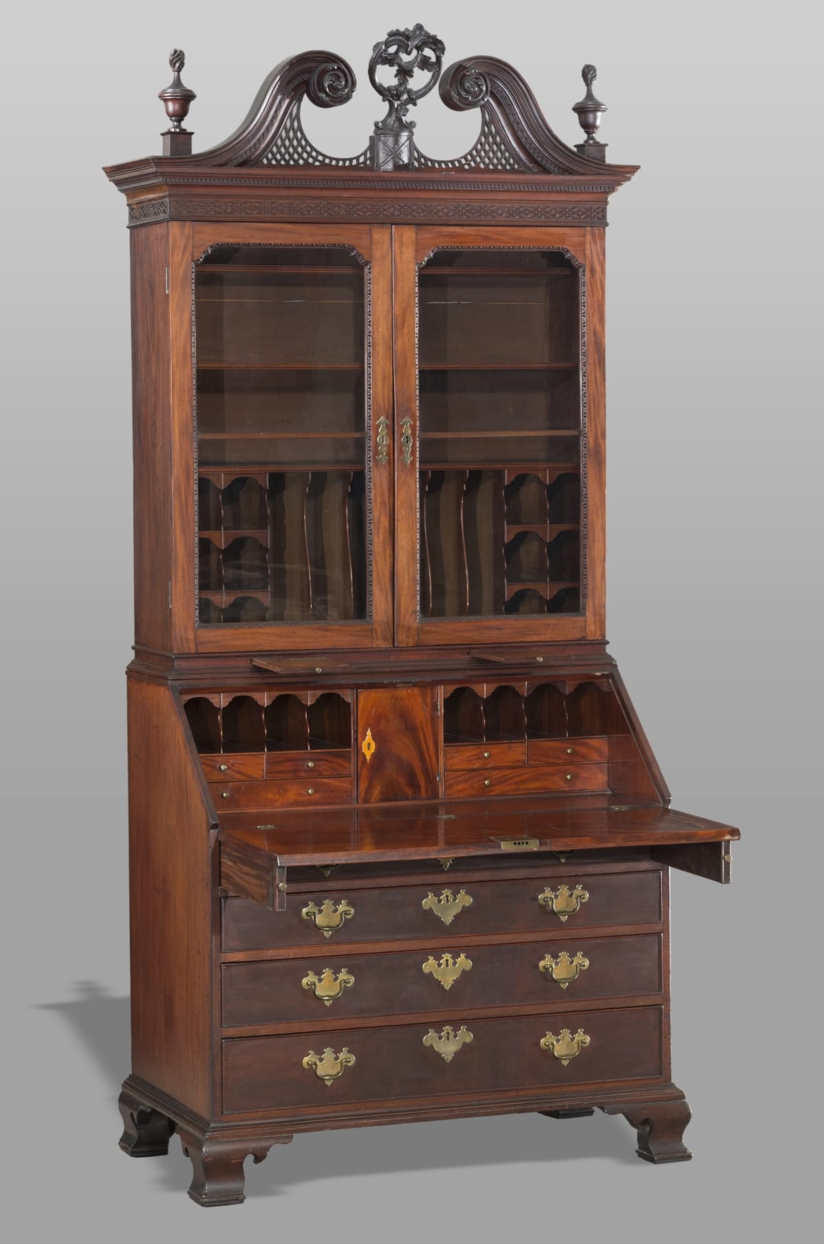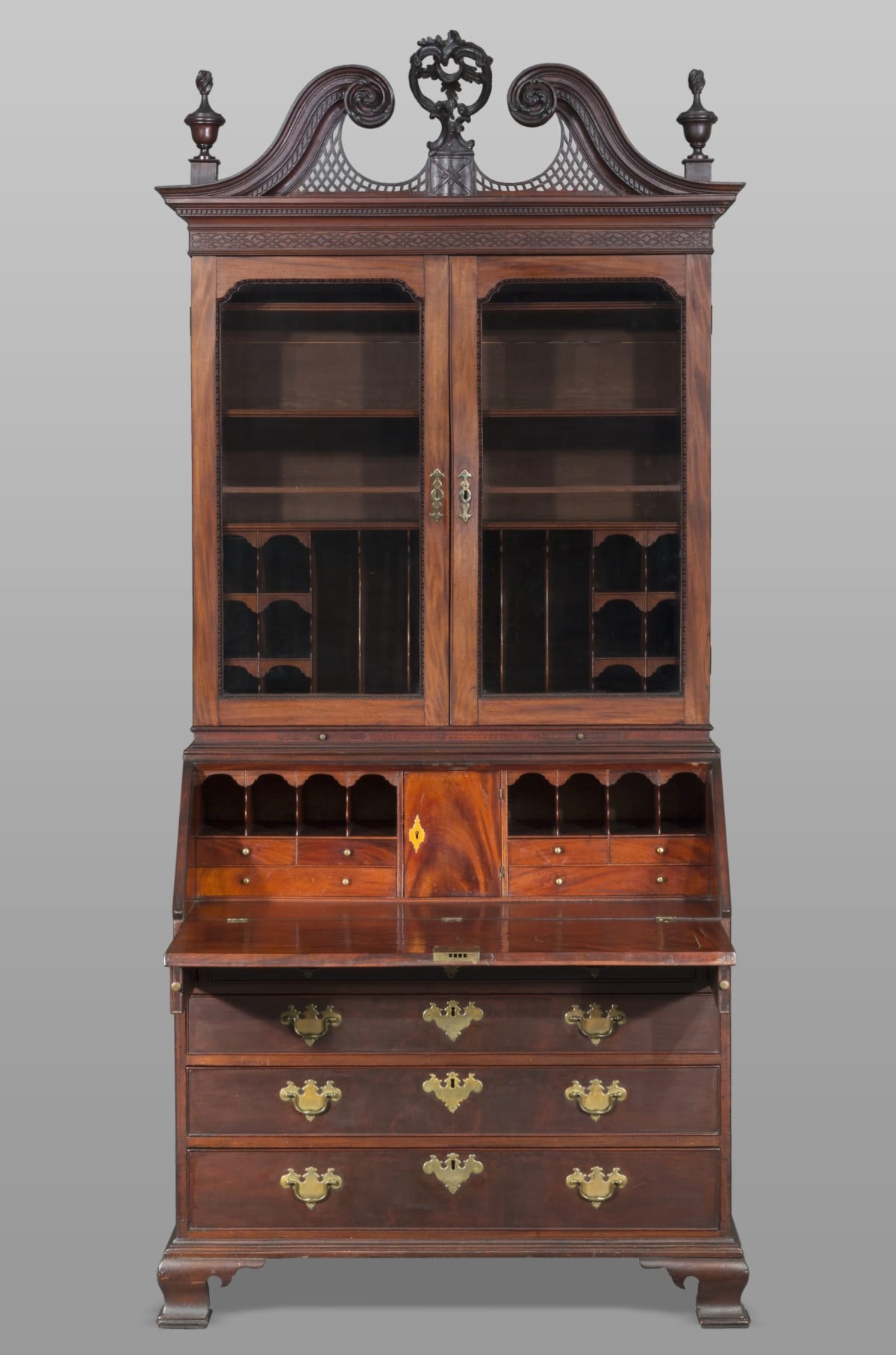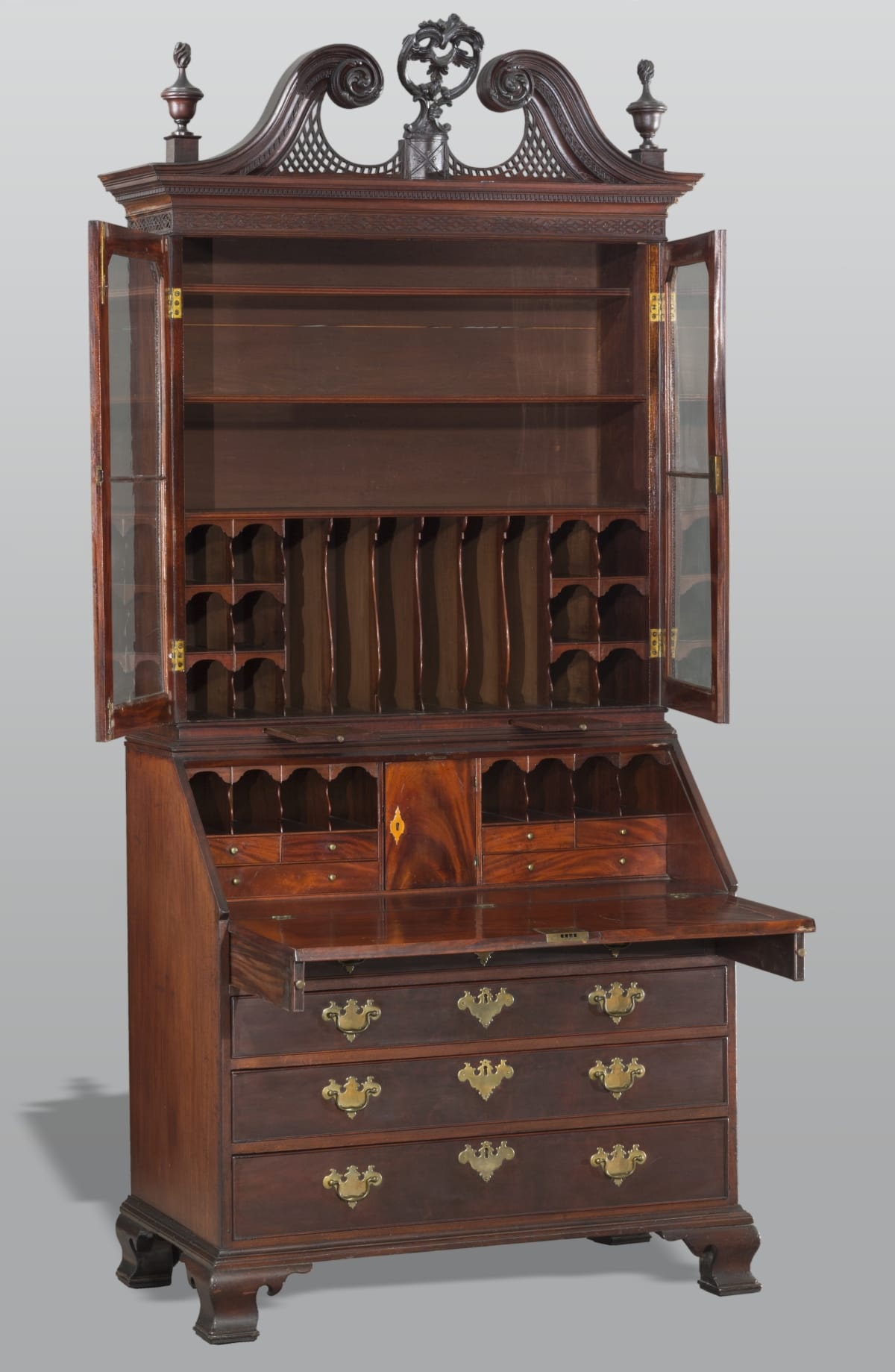 American businessmen and merchants in the mid-18th century used secretary desks as home offices. These large desks provide a writing surface, shelves for books and a storage space for papers -- perhaps even a secret drawer for important documents. Placed in a parlor or other public room, this secretary projected the owner's wealth and social status to visitors.