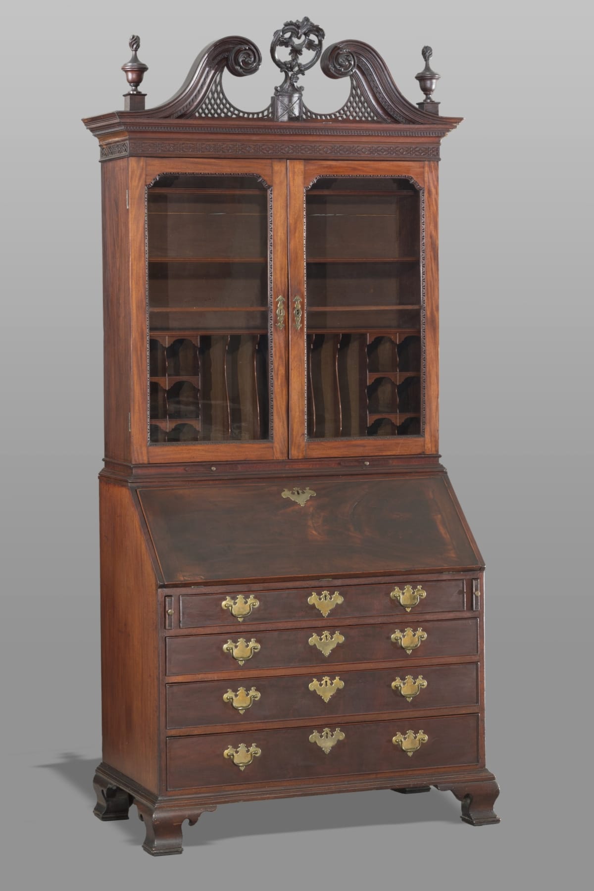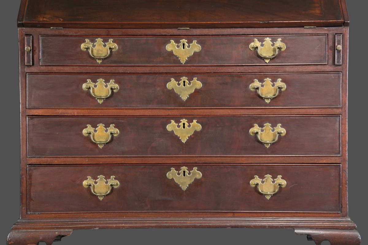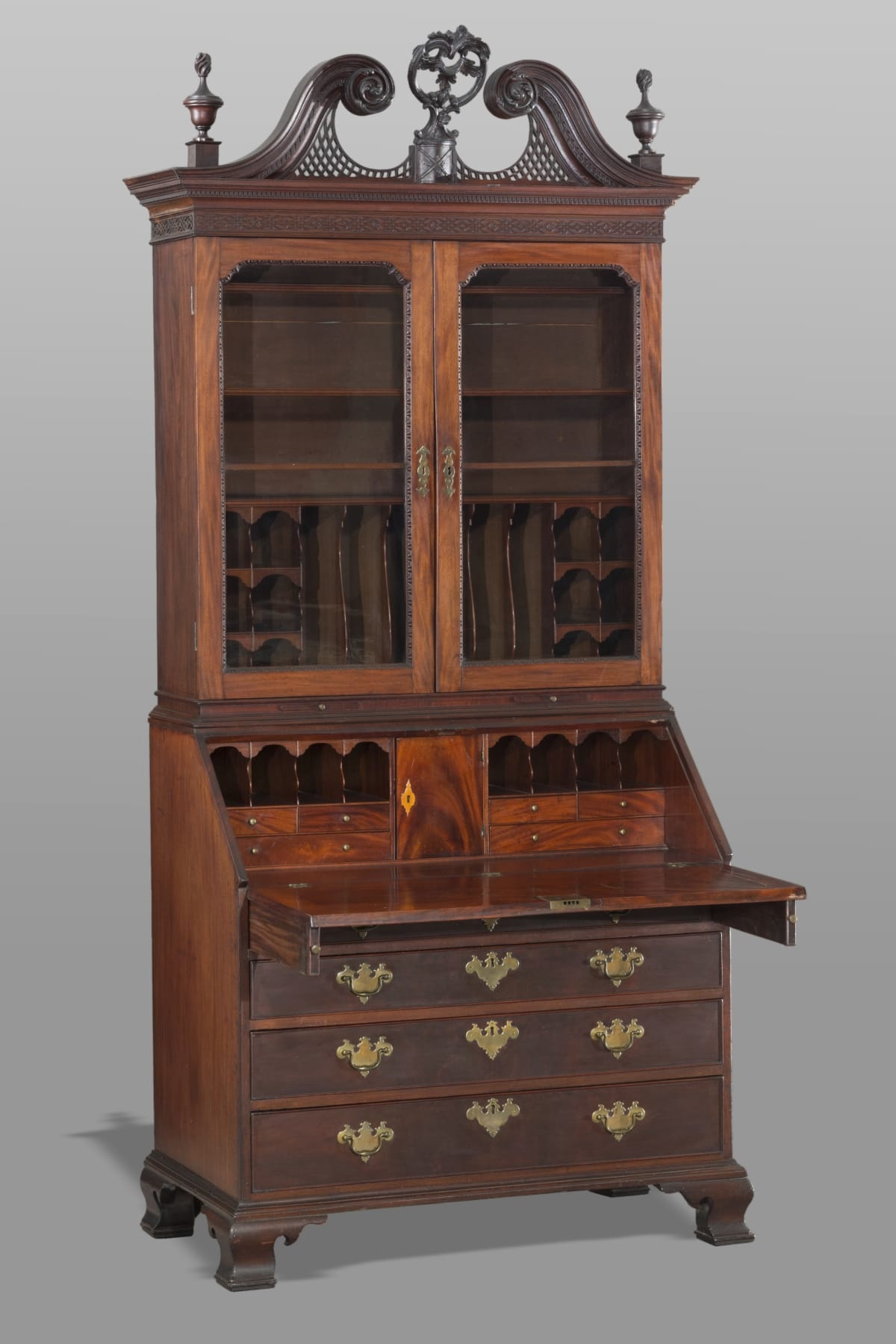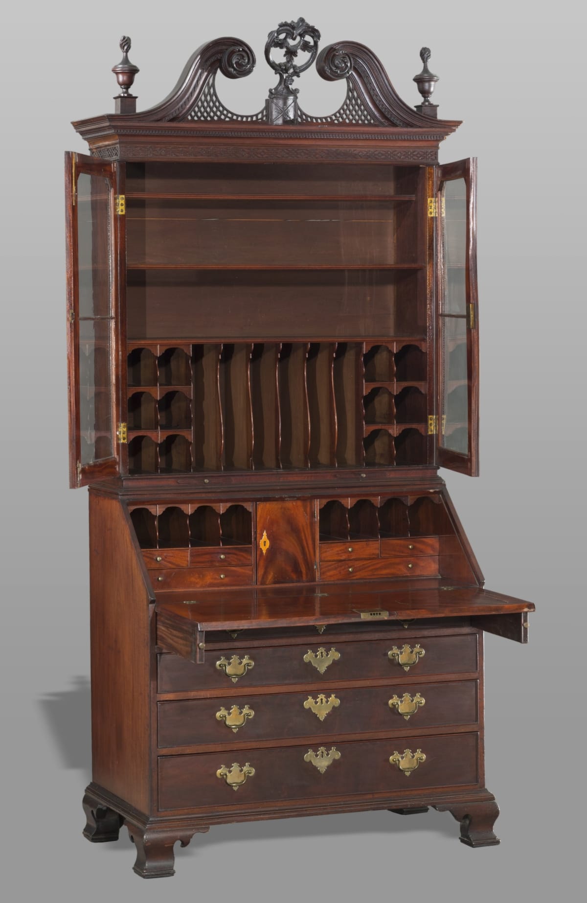 American businessmen and merchants in the mid-18th century used secretary desks as home offices. These large desks provide a writing surface, shelves for books and a storage space for papers -- perhaps even a secret drawer for important documents. Placed in a parlor or other public room, this secretary projected the owner's wealth and social status to visitors.