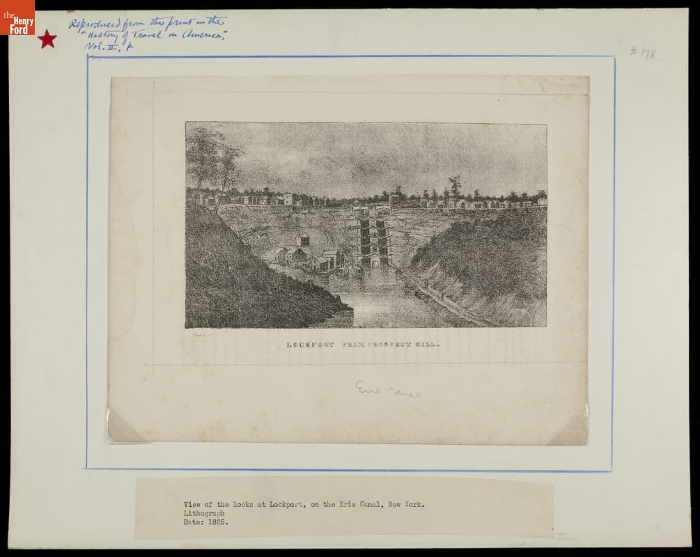 The construction of Erie Canal, connecting the Hudson River to Lake Erie, began in 1817 and completed in 1825, opened the Midwest of the United States to settlement and commerce. This lithograph illustrates a view from Prospect Hill of the locks at Lockport, New York.
