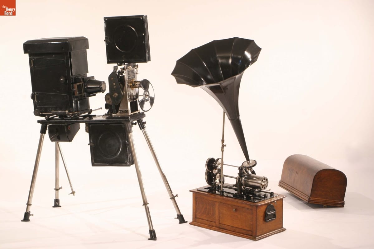 Thomas Edison invented entire industries. By the 1890s, this included the phonograph, to record and play sound, and the kinetoscope, to display moving images. In the 1910s, he was able to synchronize projecting kinetoscopes with "kinetophone" phonographs, marrying the new film industry with the already robust phonograph industry. The kinetophone played huge "concert" cylinder records. This setup would have been used in a theater, though Edison also marketed it for home use.