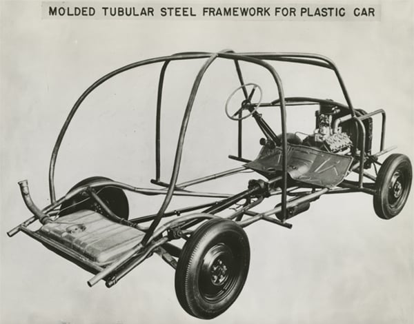 The frame, made of tubular steel, had 14 plastic panels attached to it. The car weighed 2000 lbs., 1000 lbs. lighter than a steel car. The exact ingredients of the plastic panels are unknown because no record of the formula exists today. One article claims that they were made from a chemical formula that, among many other ingredients, included soybeans, wheat, hemp, flax and ramie; while the man who was instrumental in creating the car, Lowell E. Overly, claims it was "…soybean fiber in a phenolic resin with formaldehyde used in the impregnation" (Davis, 51).