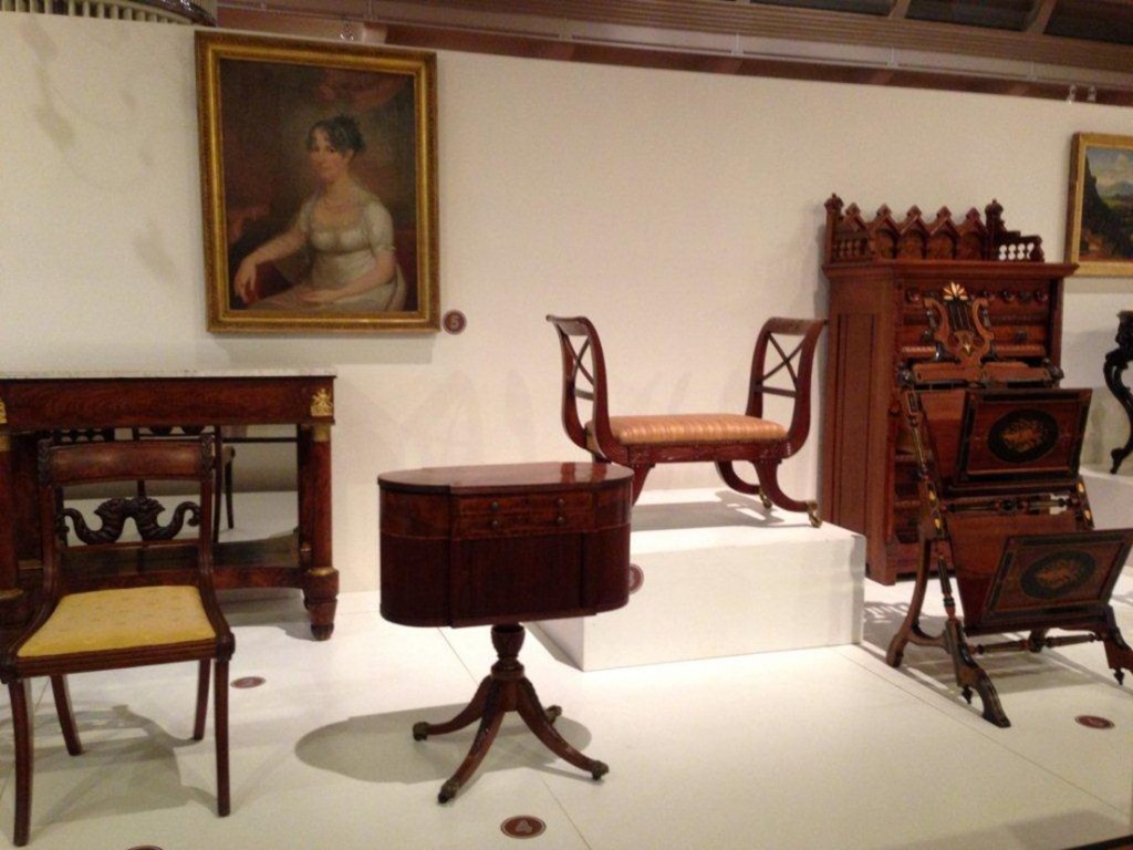 In the late 1990s our staff reinterpreted the furniture exhibit into themes such as Showing Off, Storage, His and Hers and others that we felt would prove relevant to our audience. Studies with visitors in the years since show that although they liked the thematic approach, our visitors also wanted to see a chronological development of American furniture. In 2010 we refined the installation, now called Fully Furnished, including a timeline of American furniture, arranged through broad thematic sweeps. Called In the Latest Fashion— the chronology is divided into loose historical periods, such as Fashion for a New Nation, for the early nineteenth century or Embracing Gentility for the mid-eighteenth century—the display takes visitors on a journey through the entire span of American furniture history. Should a visitor wish to delve into a particular history or style, information is available on the text panels. Because it provides a panorama of American furniture, we selected many stellar examples from the collection to share with the public.