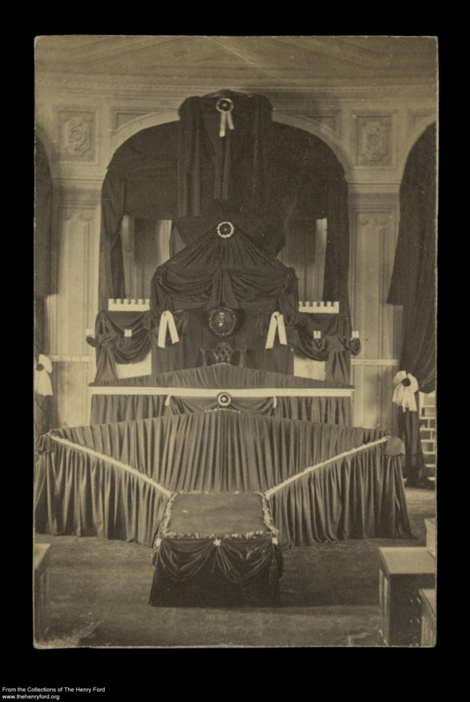 This image is of Abraham Lincoln’s catafalque, a temporary structure built to support his coffin during the three days he lay in state in the U. S. Capitol Rotunda in April 1865. Although the original photographer is unknown, we do know that D.C. Burnite of Harrisburg, Pennsylvania, created this small size photographic print called a carte-de-visite. Abraham Lincoln’s assassination on April 14, 1865, plunged Americans into deep mourning. Many people collected mementos like this to help them visualize the events of President Lincoln’s funeral and as a way of expressing the national grief.