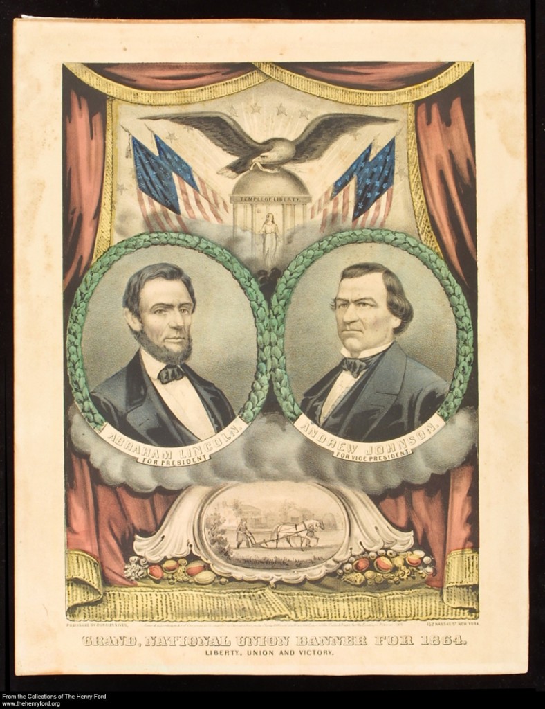 In 1864, incumbent President Lincoln and former Democrat Andrew Johnson ran on the National Union Party ticket—so named to attract War Democrats and Border State Unionists who would not vote Republican. After a gloomy summer of Union defeats and casualty lists, Lincoln’s re-election hopes seemed slim. But, finally, several Union victories gave him enough support to win the election.