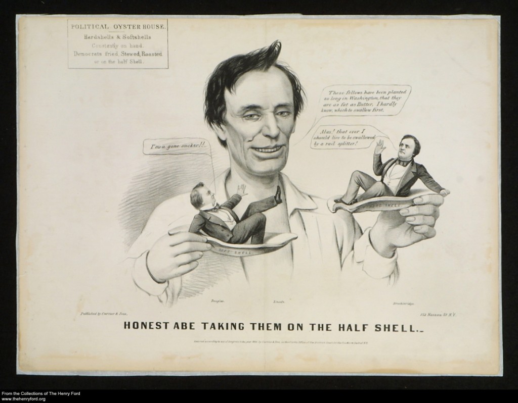 This political cartoon for the 1860 presidential campaign depicts Abraham Lincoln, the fledgling Republican Party presidential candidate handily taking on two rival candidates while eating at the “Political Oyster House.” Lincoln faced three other presidential hopefuls in all during the 1860 presidential campaign. Northern Democrats turned to Stephen Douglas of Illinois, while Southern Democrats selected John C. Breckenridge of Kentucky. John Bell of Tennessee, was a third party choice.