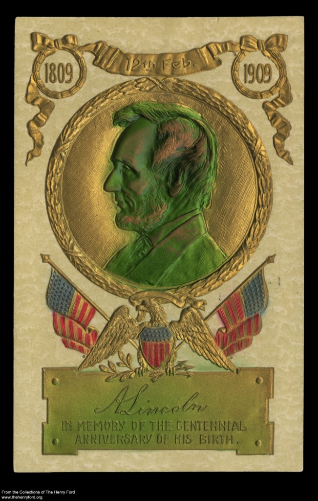 On February 12, 1909, virtually the entire nation turned out to honor Abraham Lincoln on the 100th anniversary of his birth. In city after city, Americans put aside their regional differences and sought national unity by venerating Lincoln as a “man of the people.” Postcards abounded as popular keepsakes, including this German-imported embossed example.