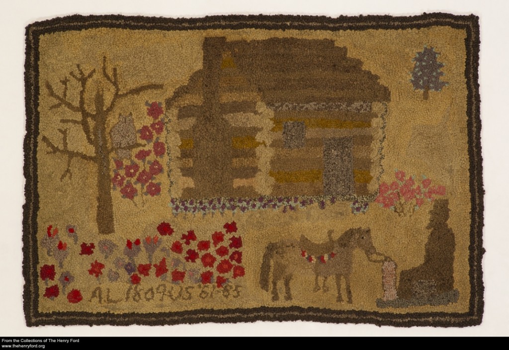 President Lincoln's 1865 assassination produced an immediate outpouring of grief. His death linked him with the hundreds of thousands of Union soldiers who had sacrificed their lives during the Civil War. He also became a symbol of the ideal democratic American who, from humble beginnings, could make something of himself. The imagery on this memorial hooked rug reinforces this notion.