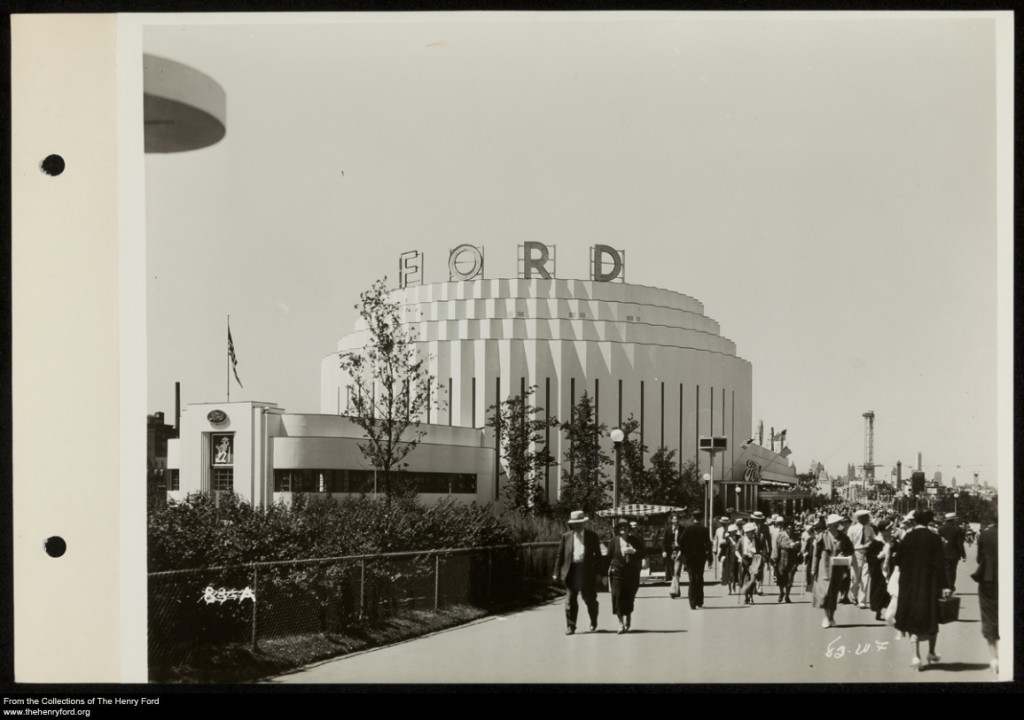 When Henry Ford decided that his company needed to have a showy building at the 1934 Century of Progress Exposition, he turned to Albert Kahn, his favorite architect. Kahn had designed Ford’s Highland Park Plant, Rouge Plant, and the classically-styled Dearborn Inn. But, for this exposition building, Kahn broke completely from traditional architectural styles and designed an imposing cylindrical structure that simulated a graduated cluster of internally-meshed gears.