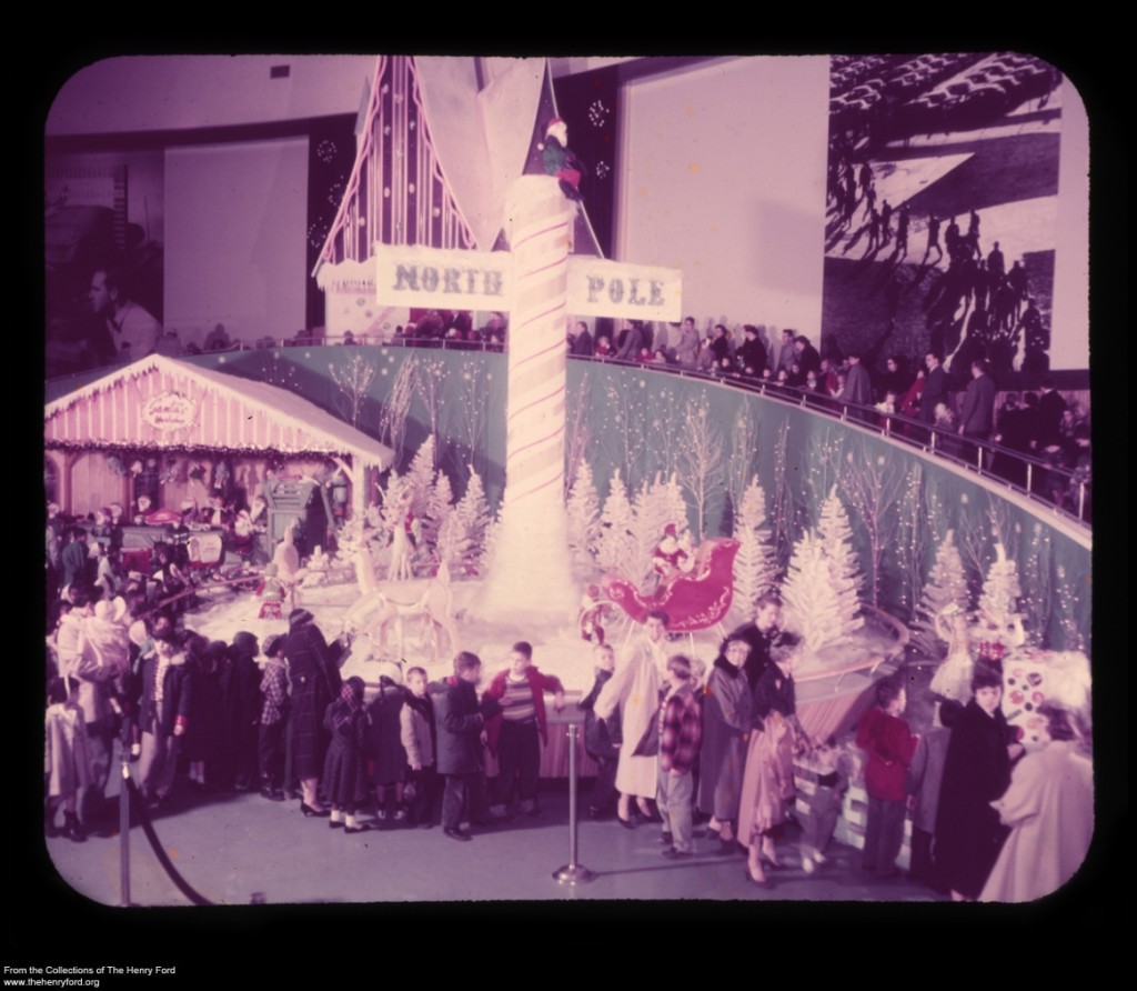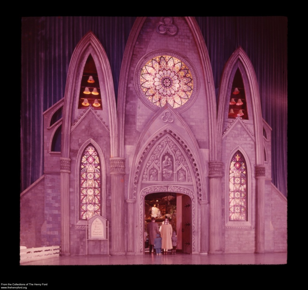 In the Rotunda’s walled-off inner court, the mood became more reverent. At the entrance to this court, visitors passed through a cathedral façade, with carillon music ringing from 40-foot spires. Inside the court was a Nativity scene with life-size figures. During an era in which stores and other businesses were closed on Sundays, this scene was considered “so beautifully and reverently executed” that the Detroit Council of Churches allowed Ford Motor Company to keep the Christmas Fantasy open on Sundays during the Christmas season. An organ set alongside the Nativity scene provided Christmas music while Detroit-area choral groups gave concerts here periodically.