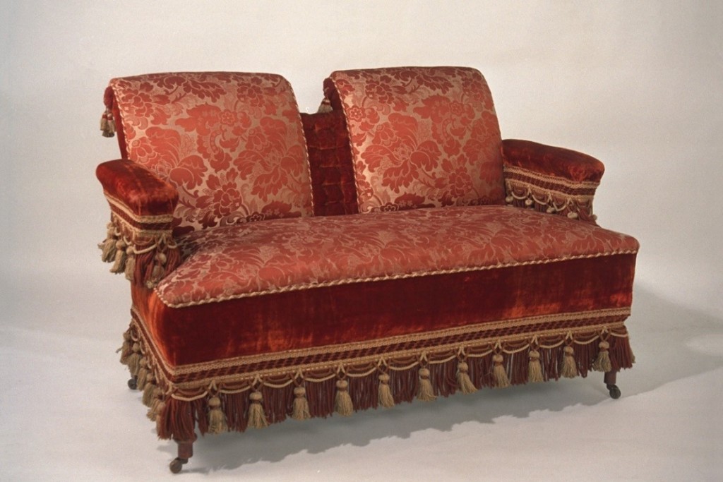Our “Turkish Settee” is part of a suite of furniture dating from 1885-1895. Its elaborate original fabrics and trimmings are faded and somewhat fragile, but it makes an important statement about the style of the times, so preserving them is important.