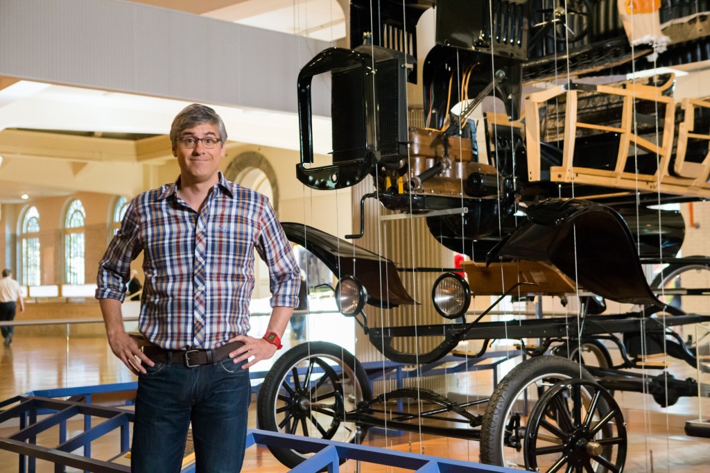 Mo Rocca, host of "The Henry Ford's Innovation Nation," poses with the exploded Model T in Henry Ford Museum during filming. (Event Photography by KMS Photography)