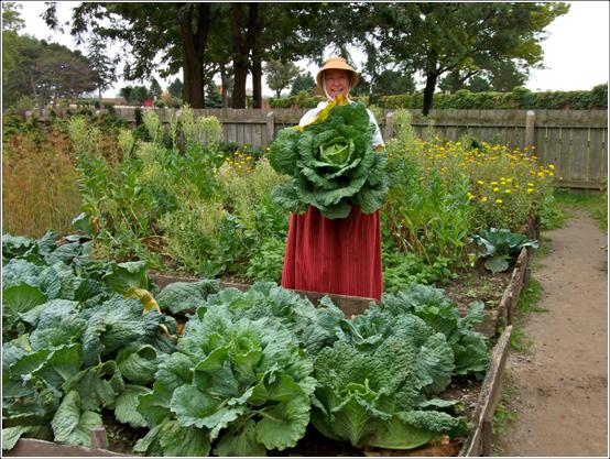 This is another location with raised beds, which were just rebuilt last year; we grow a variety of vegetables, herbs, flowers and even concord grapes – and just look at how big the cabbages we grow can get!