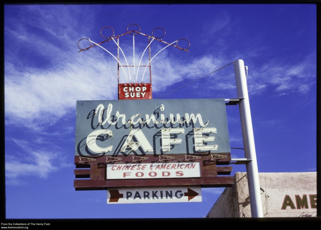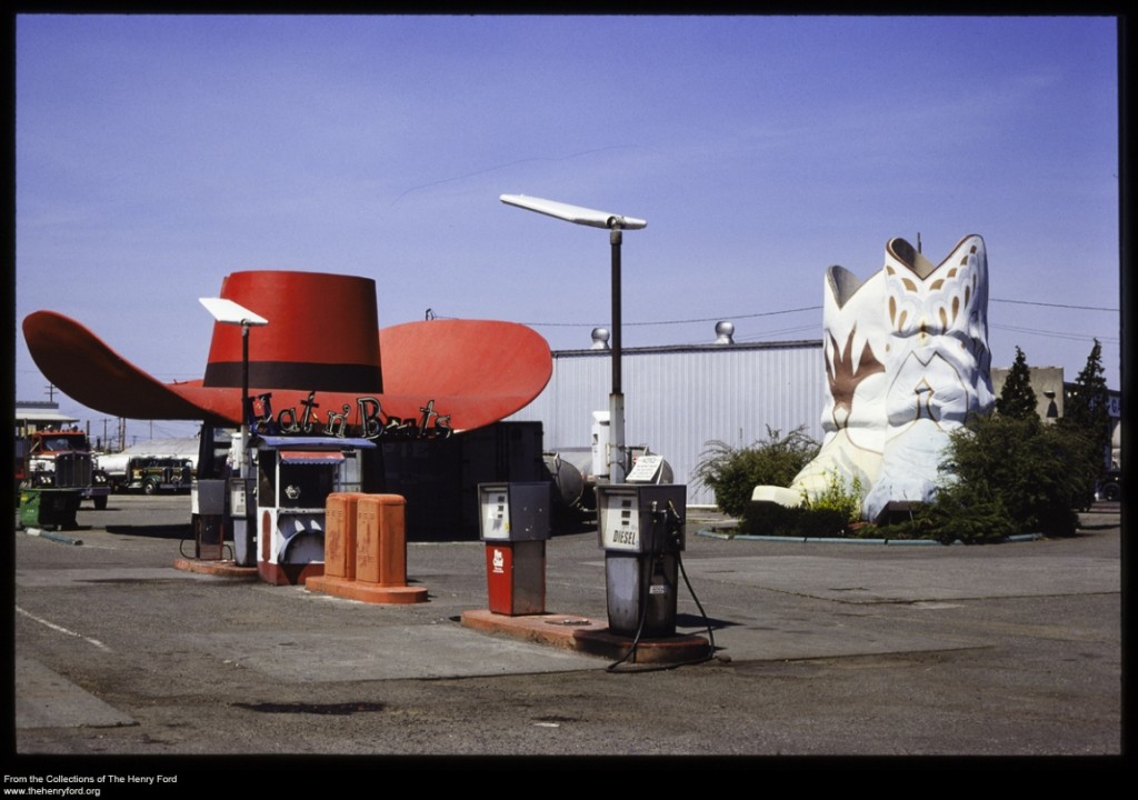 We didn’t really start appreciating the American roadside until it had virtually disappeared. By the late 1970s, massive urban renewal projects made us want to preserve historic neighborhoods and streetscapes. In 1977, the Society for Commercial Archaeology was formed, devoted to the buildings, artifacts, structures, signs, and symbols of the 20th-century commercial landscape. The decommissioning of Route 66 in 1985 almost immediately led to an outpouring of interest to demarcate and preserve sections of this most iconic of American highways. The mushrooming of predictable fast-food chains led to a revived interest in old roadside establishments, like diners—including Lamy’s Diner, moved to Henry Ford Museum and restored for the 1987 exhibition “The Automobile in American Life.” Increasingly, diners, service stations, and other old commercial buildings garnered enough respect to be nominated for entry into the elite National Register of Historic Places.