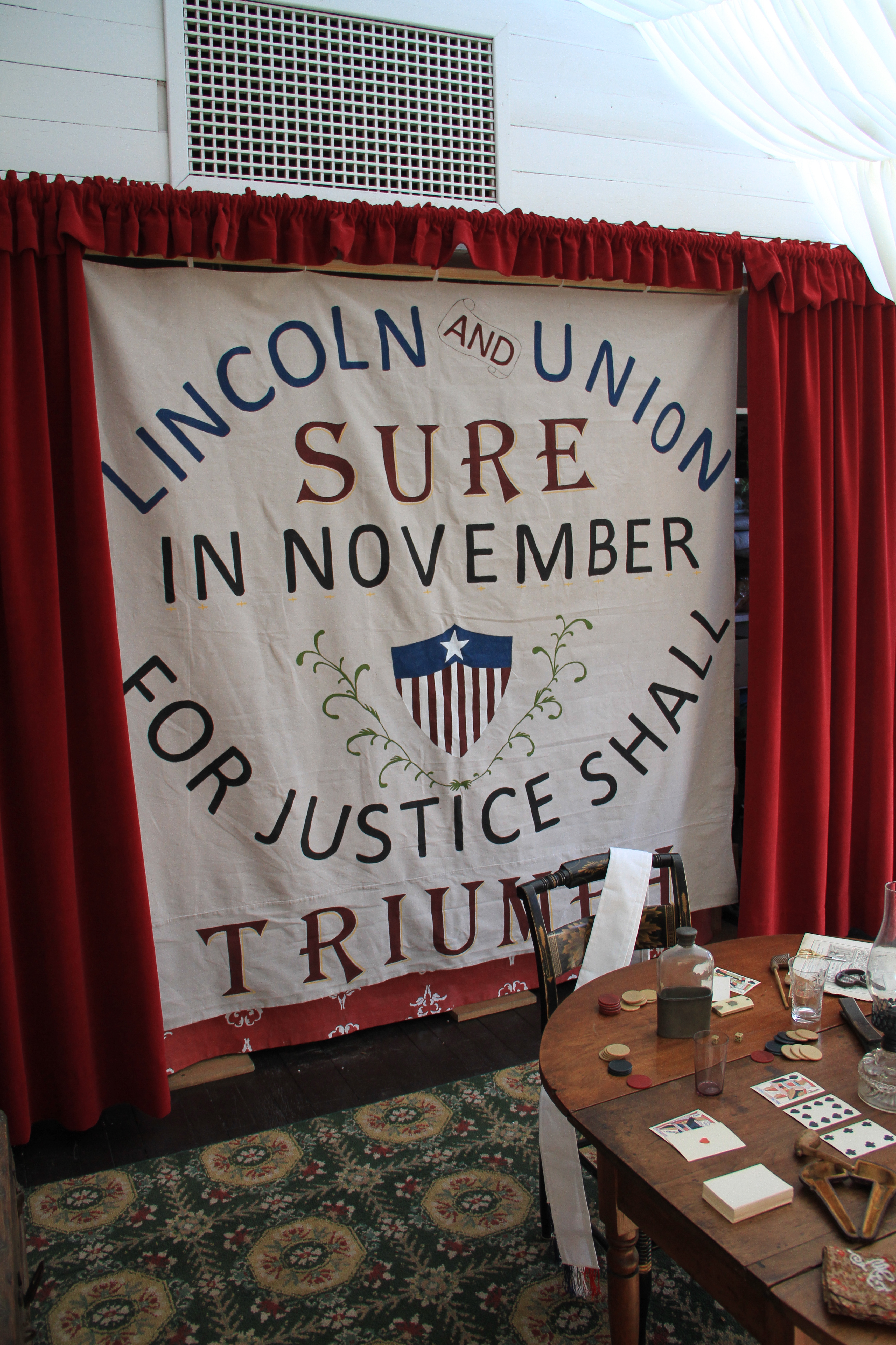 Had Greenfield Village been an actual town in 1864, its Loyal Union League may have been furnished rather modestly. Using this as our inspiration, The Petticoat Society gathered original artifacts and good reproductions from our personal collection to outfit the Greenfield Village Tintype Studio for the weekend. A mid-nineteenth century wood drop-leaf table was the central feature, staged with artifacts including original drinking flasks, smoking paraphernalia, and Civil War-era games such as dice, dominoes, poker chips and cards. An étagère on the south wall was laden with period political books and histories of the young nation, parian busts of George Washington and Thomas Jefferson, and cut glass whiskey decanters. Along the north wall, we provided a modest table for league members to dine in between campaign activities. At the front of the room, a small exhibit of artifacts included original patriotic silk rosettes, carte de visite photographs of President Lincoln, and a portrait of a Wide Awake in full uniform (Wide Awakes were another club that rallied for Lincoln’s election in 1860.) The exhibit was completed with reproduction campaign posters, banners, ballots, and poll books.