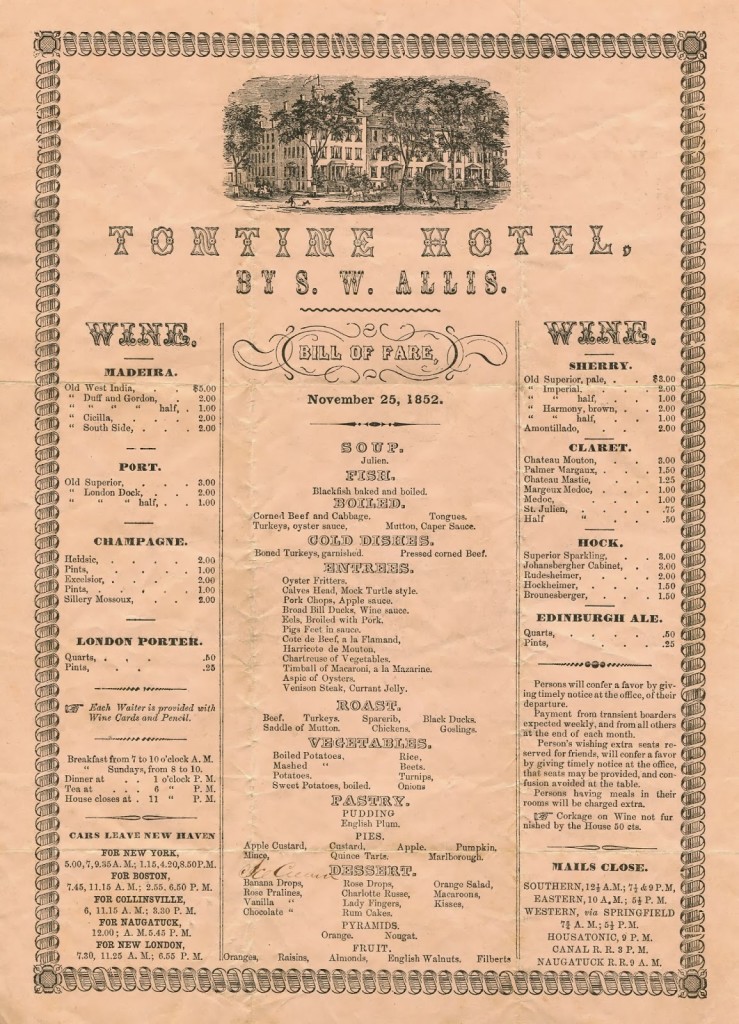 It seems that Lucy’s long relationship with Louisa and her occupation as a servant changed after Rebecca’s death. It does seem that Lucy maintained a relationship with her sister. The Federal Census of 1850 lists Lucy living in New Haven as head of household along with 37 year old Teresa Griffin, and 75 year old Elizabeth Dowlin. No occupation or personal wealth is listed and Lucy is 40 years old. (See image of 1850 United States Census) The records indicate that Lucy lived in a two-family dwelling. Her inheritance from Noah Webster actually left Lucy a wealthy woman and as described by Emily Fowler Ford, “wealthy in her church and society.” She had taken a little house in the outskirts of New Haven, and for years made all the fine pastry for the Tontine Hotel, a fine and well respected establishment in town. She also made additional earnings from “doing up” fine muslins, dresses, and embroideries. She was “of much consideration for years among her race.” Unless it took place much later in life, it appears that Lucy never married and never had children of her own.