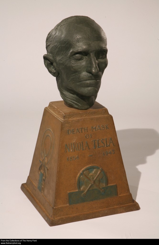 This copper mask captures the likeness of electrical pioneer and experimenter Nikola Tesla. It was made immediately upon the latter's death in 1943, at the request of publisher and writer Hugo Gernsback, a friend of Tesla's.