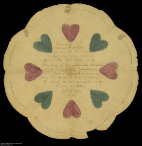 Giving students a new perspective on education through our One-Room School program has been so rewarding. It’s also been fun for us to learn more about the history of education and to sift through The Henry Ford’s many school-related artifacts. In the archives, we found many rewards of merit. During the nineteenth century, teachers rewarded students for excellent work or good behavior with these paper cards. Probably the most historically significant reward of merit we found was a handmade one given by 17-year-old teacher, Alexander McGuffey, to his student, Sarah White, in 1833. Alexander McGuffey was the younger brother of William Holmes McGuffey, originator of the McGuffey Readers textbook series and he himself the writer of the Fifth and Sixth Readers.