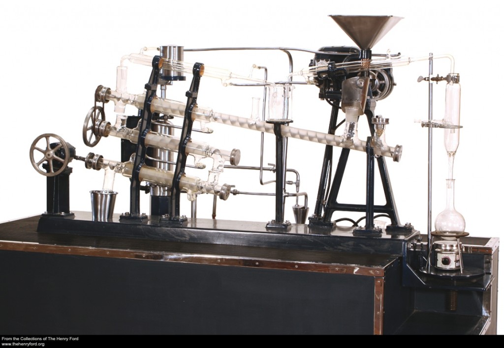 To make soybeans useful to industry, the oil needs to be separated from the bean. The problem was that pressure alone did not remove all of the oil, so beans quickly became rancid. The Chemical Lab staff developed a continuous percolator or extractor that used a series of inclined screws to move chopped soybeans through a light gasoline solvent. The solvent removed the oil, and left the solids. The solvent was evaporated from the oil mix, leaving the pure soybean oil, and then the solvent was condensed back into a liquid ready for re-use. The oil was used for paints, while the solids were used in a variety of plastics applications. To Ford, the beauty of the process was its simplicity—it didn’t have to be carried out in a factory setting.