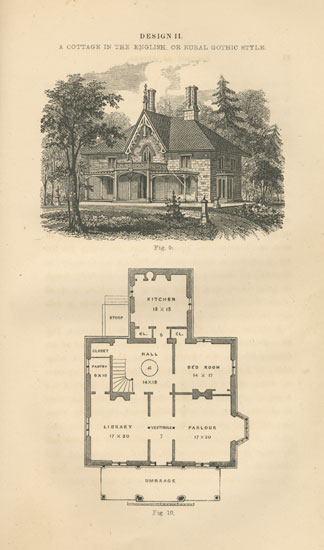 Prominent architect Andrew Jackson Downing—a big fan of the Gothic Revival—offered house designs in this picturesque style for middle-class Americans in his 1842 book, Cottage Residences. This illustration has the most self-conscious gothic elements—in the chimneys, windows, and the “gingerbread” detail in the central gable. (THF.110992)
