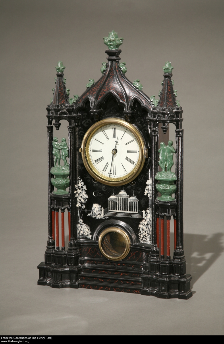 This mass-produced “cottage” clock, made by Brewster & Ingraham of Bristol, Conn., between 1844 and 1852, merely hints at the Gothic style with its pointed top and simple spires. Thousands of clocks like this one found a place in American homes during the mid-19th century.