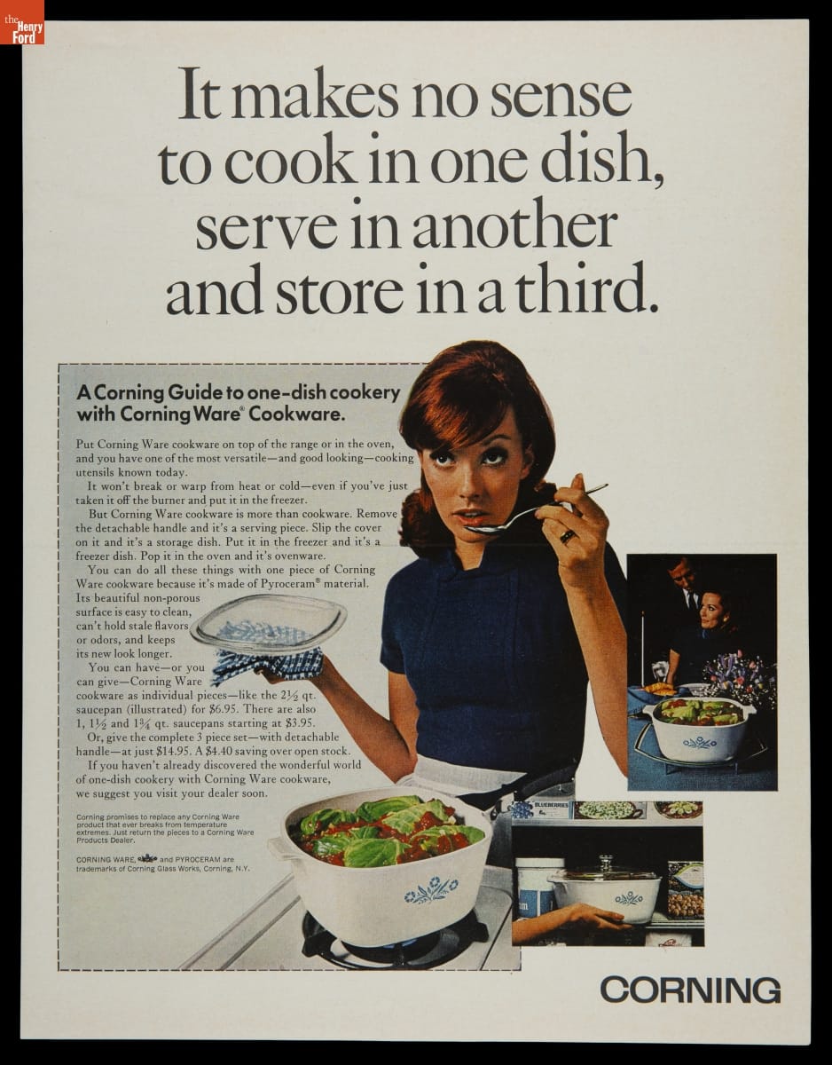 Next up? The accidental discovery of a new material — glass-ceramic — by a Corning research chemist in 1952. The gleaming white opaque material could withstand extreme cold and heat and didn’t break when dropped. First used in nose cones for radar-guided missiles, this new material found its way into the kitchen in 1958 as Corning Ware — a line of innovative, shatterproof cookware that could go right from the freezer to the oven or range and then to the table as a serving dish.