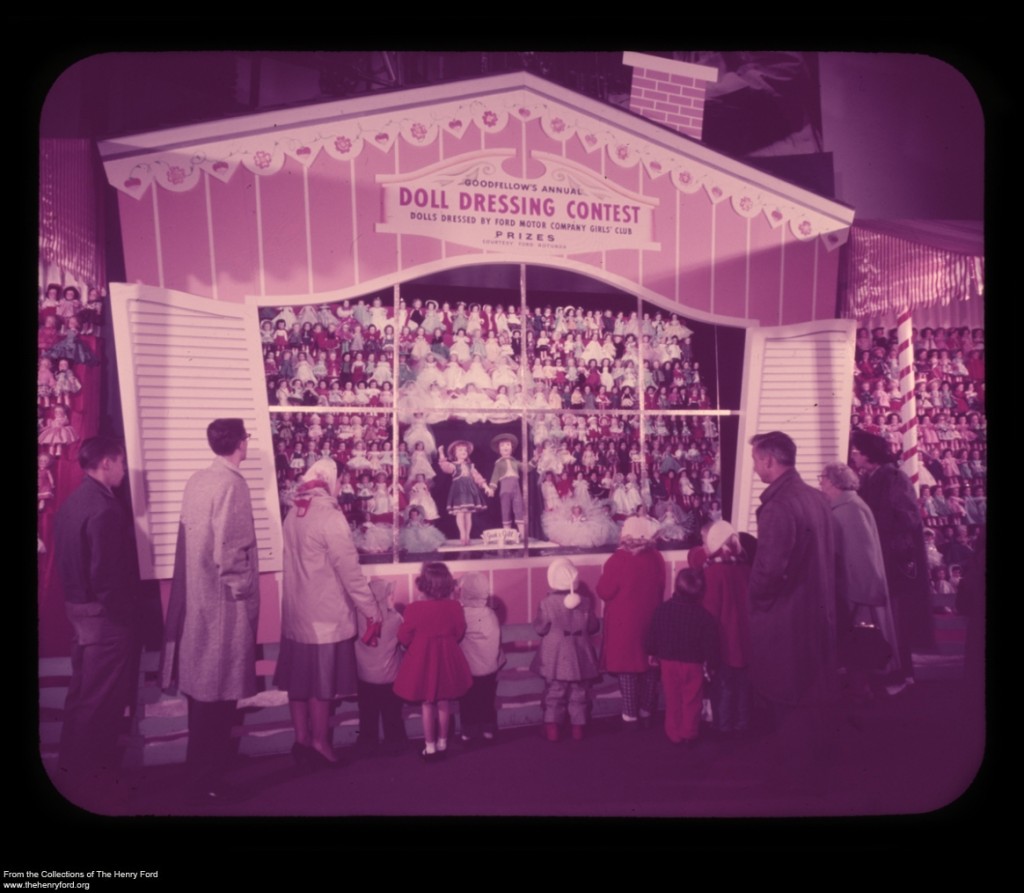 Dressing Goodfellows dolls has been a Christmas tradition in Detroit since 1924, and the Ford Motor Company Girls’ Club was a major participant in dressing Goodfellows dolls for underprivileged children in Detroit for many years. Starting in 1946 by dressing 65 dolls, the club’s peak donation was 3,000 dresses in 1967, 1969, and 1970, and they averaged between 1,500 to 3,000 dolls most years.