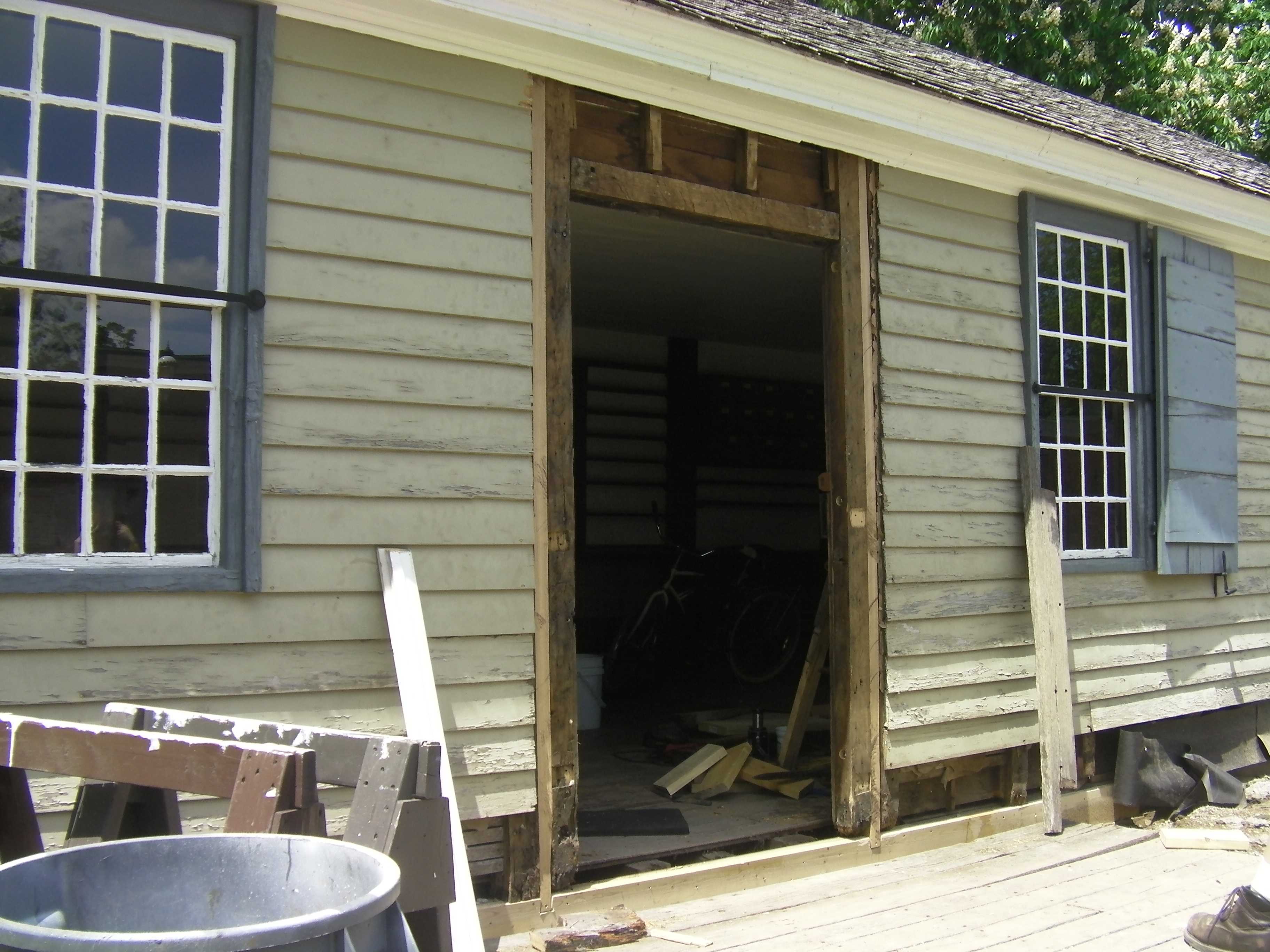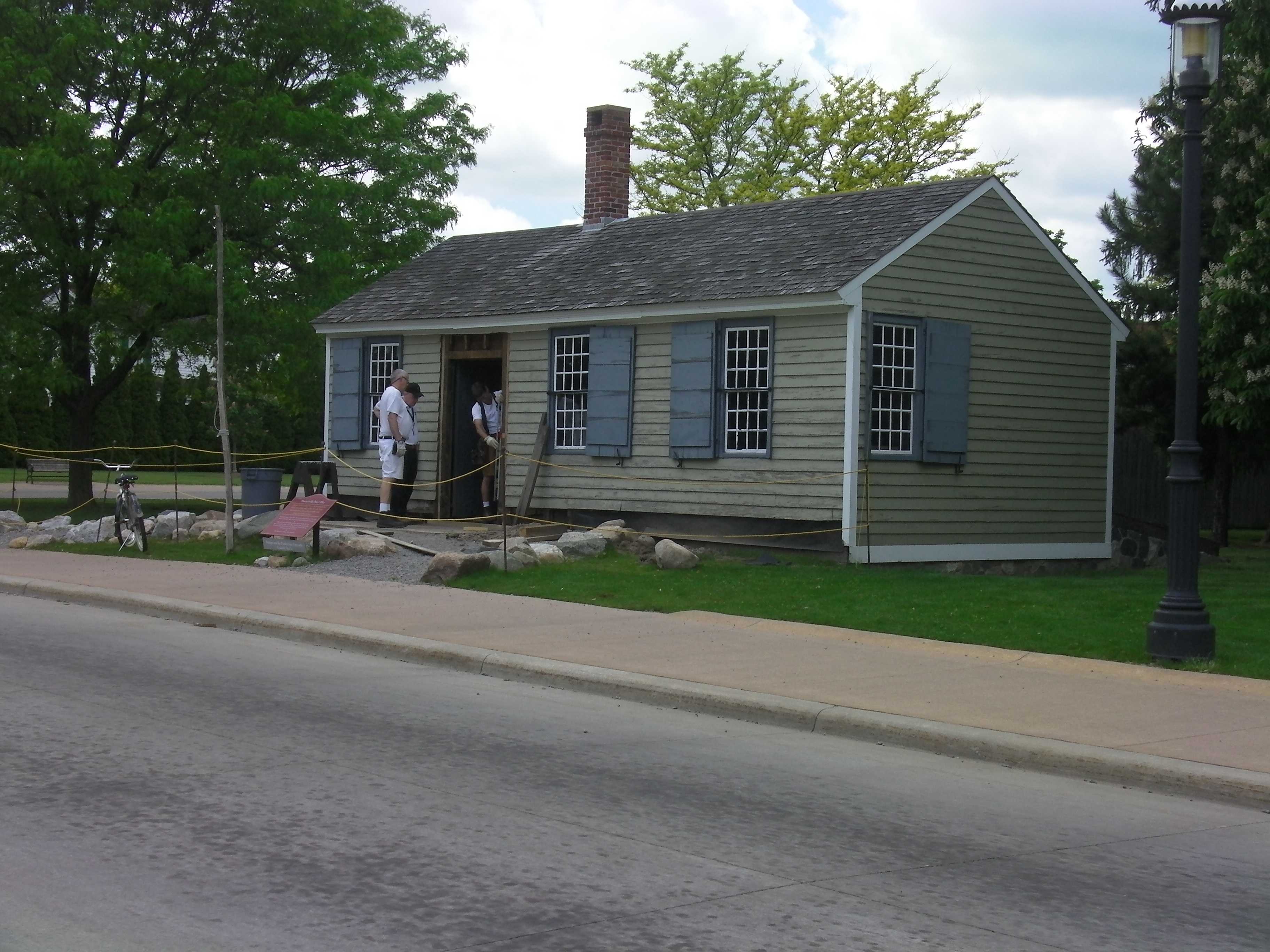 When the Phoenixville Post Office was moved to Greenfield Village from Connecticut in 1928, it was placed on a foundation that was smaller than the building. This size difference caused the entire building to shift, bow out and lean forward with time. This movement also caused the front door to lean and become crooked.