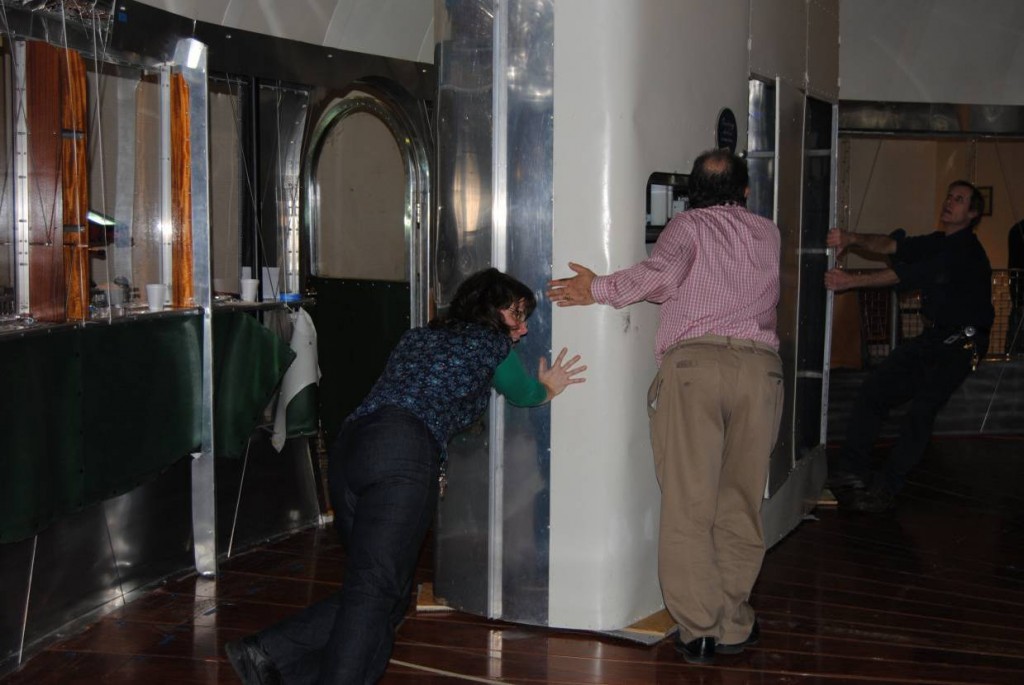 In early February, the Conservation Department did its yearly inspection of the Dymaxion House with the assistance of Historic Operating Machinery Specialist Tim Brewer. As you’ll recall, it is truly a “tension” structure; the “cage” actually hangs the house off of the central mast. Every year we compare measurements of the cage rings to see what might be out of alignment. We also measure the tension on critical cables and adjust them as necessary.