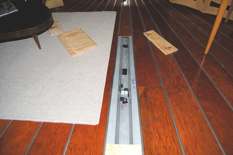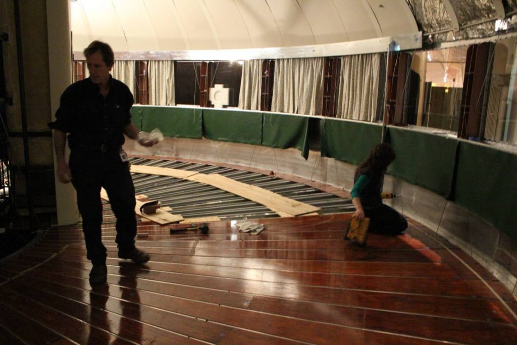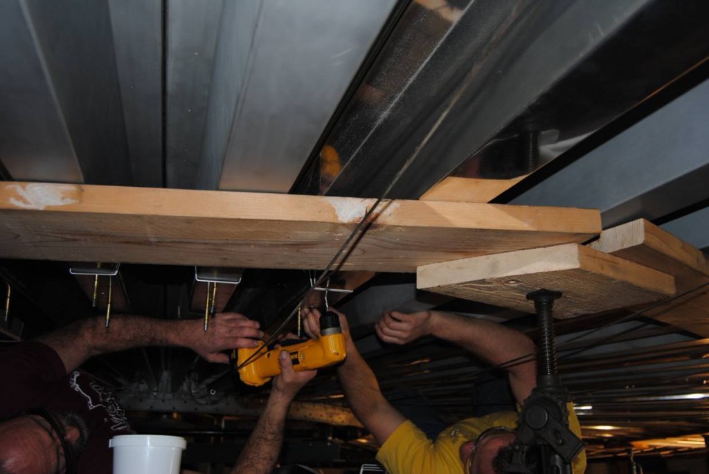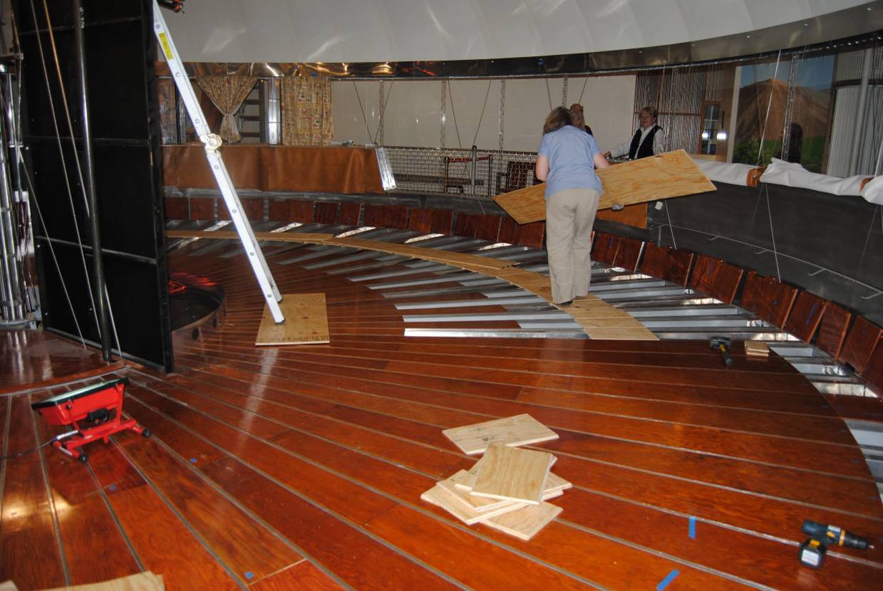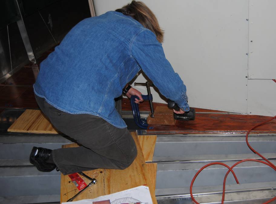 Meanwhile, we worked with staff carpenters to make a new “over-floor” of plywood to install under the carpet.  This serves to spread the load of visitors’ foot-falls, reducing that flexing stress that causes fatigue in metals.