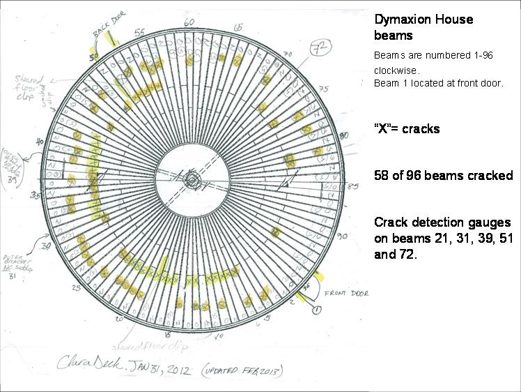 The cracks were developing due to the flexing of metal at the sharp edge of L-shaped brackets supporting the beams. Remember, there was no precedent for the use of aluminum in this architectural application, so we guess that Bucky was never aware he had allowed this fundamental design flaw. The house was a prototype in process - so it's understandable.