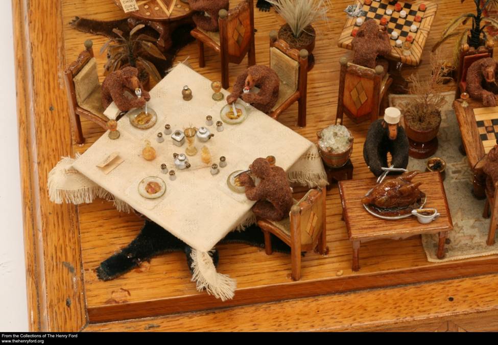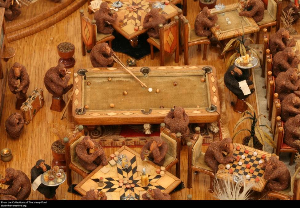 Culhane intended the diorama to depict many of the worldly pitfalls that had put him and his fellow inmates on a path to prison. The Bar is chock full of monkeys engaged in all kinds of rambunctious activities—drinking alcohol, gluttonous eating, smoking (cigarettes, cigars, and opium), gambling and gaming in many forms (craps, roulette, checkers, shell game, and cards), playing music, monitoring the stock market via a ticker, and even paying off a policemonkey. Clearly some of the monkeys are ready to check into (or out of) the associated hotel, as they have their suitcases with them and keys and mail are visible behind the desk.