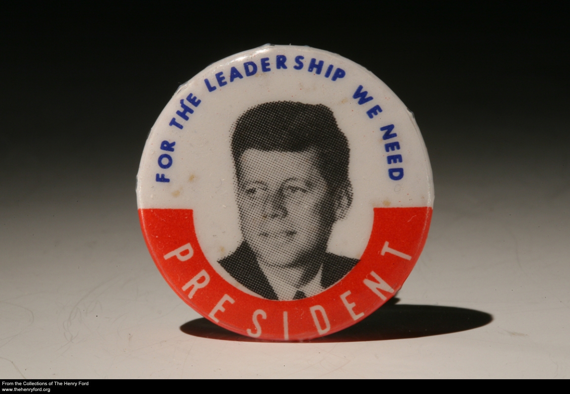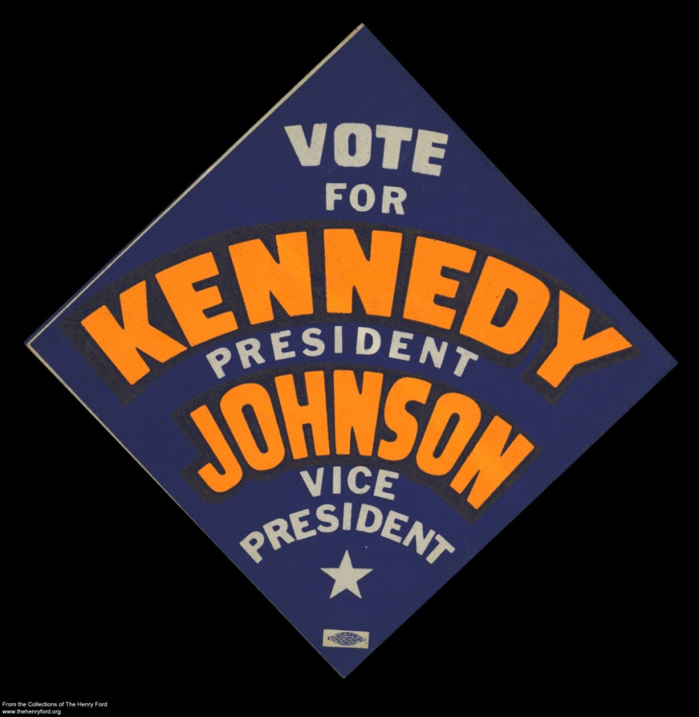 Using giveaways like this campaign bumper sticker, Democratic Senator John F. Kennedy launched an exhaustive campaign in 1960 against Republican opponent Vice-President Richard M. Nixon. Despite charges that he lacked experience and that his Catholic background would hurt him, Kennedy eventually won the very close 1960 election.