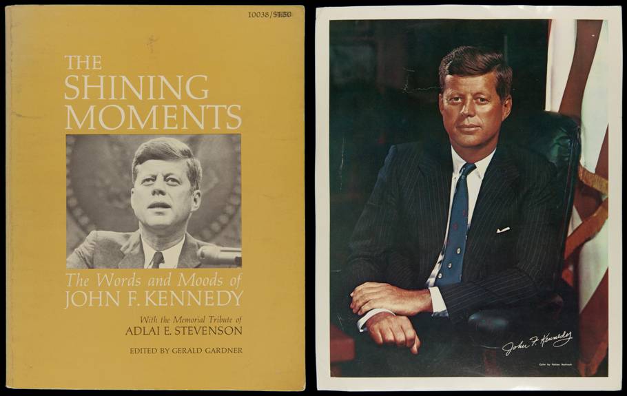 On left: Book, "The Shining Moments: The Words and Moods of John F. Kennedy," by Gerald Gardner with a memorial tribute by Adlai E. Stevenson 1964. (Object ID 2013.50.20) On right: Offset lithograph print with facsimile signature of John F. Kennedy, probably made in 1964. Fabian Bachrach made the original color photograph in 1960 of Senator Kennedy. It was often used during Kennedy's presidential campaign. Later this image became a popular memorial portrait of the slain President. (Object ID 2013.50.22)