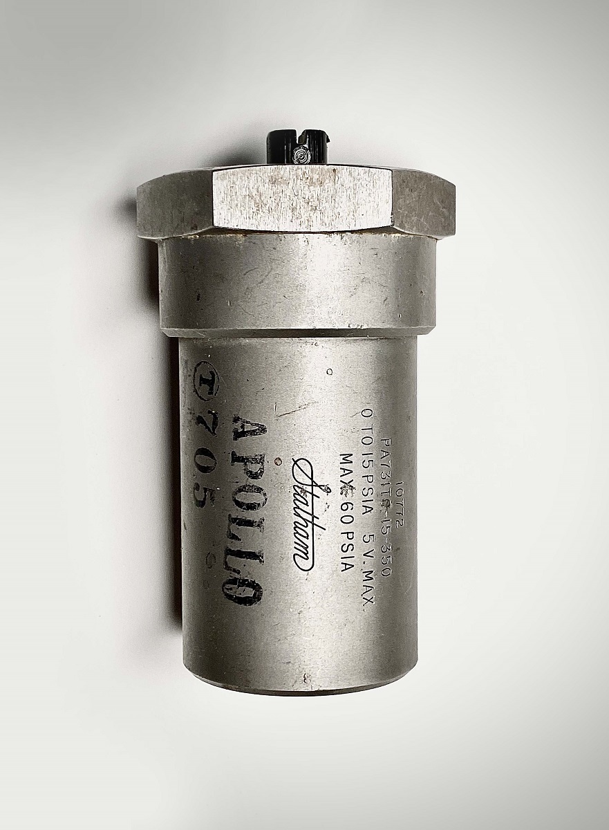| Among Dan Winters’ desktop mementos are two pieces of equipment from the Apollo program: a pressure transducer (left above) and an RCS check valve assembly, still bagged (right above. Both were procured from a Los Angeles scrap dealer who capitalized on the closure of a Van Nuys plant operated by Rocketdyne, manufacturer of the Saturn V engines. The keepsakes have remained within reach ever since. | |