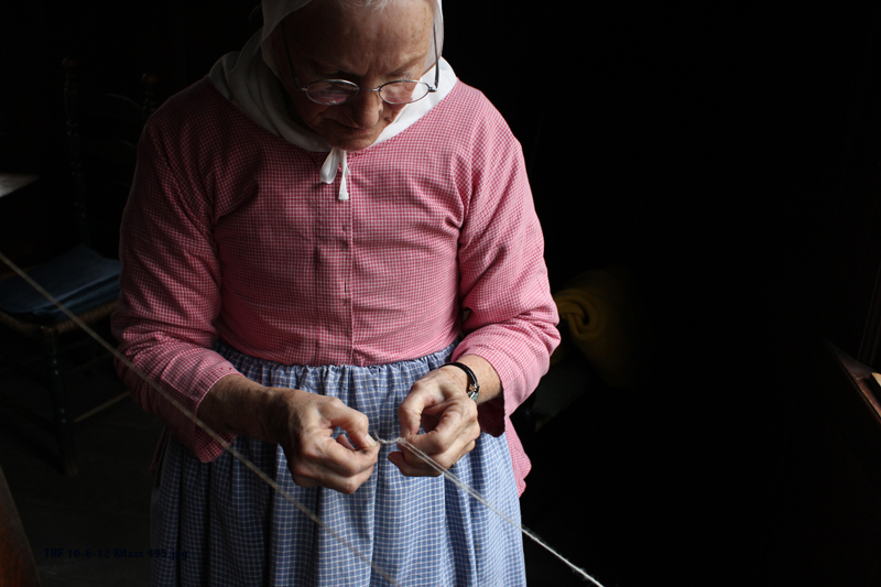This presenter stands for a final fitting of a new custom ensemble as a seamstress inspects. Tracy Donohue, the manager of the clothing studio said they make most all elements of period attire, with the exception of a few foundational garments such as corsets. Uniforms are also purchased in pieces, but all are tailored for each wearer.