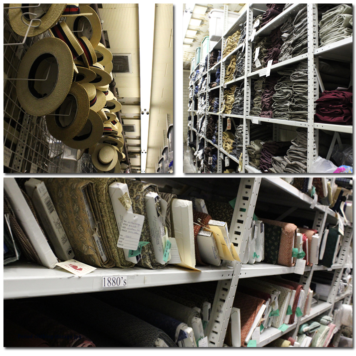 I have to say, the studio storage warehouse is a pretty spectacular place – with aisles and aisles of period clothing, historically accurate fabrics and accessories, and the fantastic costumes for special events like the Hallowe’en in Greenfield Village and Holiday Nights.