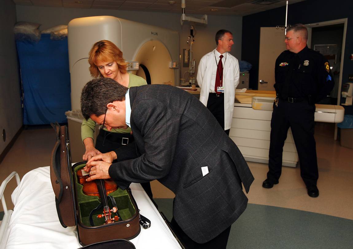 Radiologist Dr. John Bonnett of Henry Ford Hospital and luthier Ray Schryer (Schryer Violin) partnered with Henry Ford Museum staff in 2010 to create CT scan (computed tomography) images of the violins in a quest for information concerning their condition and past repairs. Among other findings the scans revealed areas of old insect damage, previously unseen by the naked eye, in addition to delicate repairs on the interior of the museum’s Guarneri Del Gesu violin.