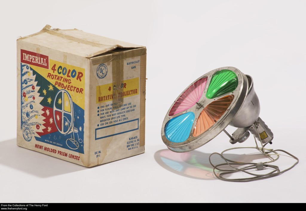 The Aluminum Specialty Company of Manitowoc, Wisconsin, is credited with starting the craze for aluminum Christmas trees—producing and selling more than one million of these trees between 1959 and 1969. Their flagship tree was called “Evergleam”—an ironic play on the word “Evergreen.” Once other aluminum manufacturers caught on to the popularity of these trees, they produced their own versions. The additional purchase of a color wheel produced a delightful variety of colors on the tree’s silvery needles and branches.