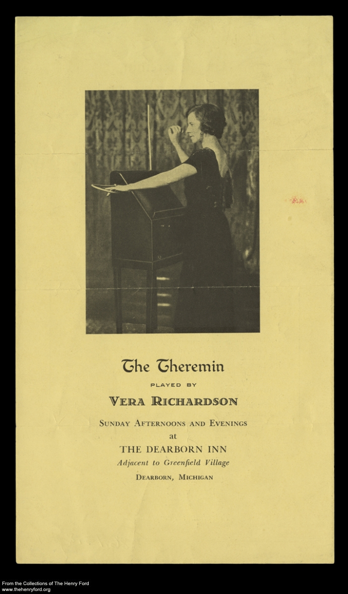 In the mid-1930s, Richardson began a weekly residency at the Dearborn Inn. Envisioned by Henry and Edsel Ford, the hotel incorporated design elements from New England inns built during the colonial period. A stone’s throw from the Henry Ford Museum and Greenfield Village, the inn opened in 1931 and quickly gained a stellar reputation for its elegance and colonial charm. It was in this environment that Vera Richardson performed her Sunday concerts, which were likely held in the hotel’s cocktail lounge. This time, though, it wasn’t her piano skills that she shared with the audience. Instead, the instrument she manipulated was unfamiliar to most. It was a device that didn’t exist in the not-too-distant past, and was seemingly from a world that did not yet exist. With just a wave of her hands, Richardson was able to produce otherworldly sounds, both beautiful and frightening.